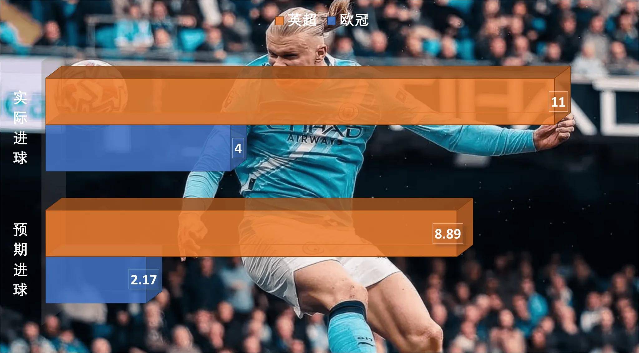 ในพรีเมียร์ลีกและแชมเปียนส์ลีก ฮาแลนด์มีค่าคาดการณ์การทำประตูอยู่ที่ 11.06 แต่เขาทำประตูได้จริงถึง 15 ประตู ซึ่งเกินกว่าที่คาดการณ์ไว้ถึง 36% ประสิทธิภาพที่น่าทึ่งนี้ไม่ได้มาจากการพัฒนาทักษะการโหม่งของฮาแลนด์เพียงอย่างเดียว แต่ยังมาจากการที่เขานำวิธีการทำประตูใหม่มาใช้ ซึ่งทำให้กลยุทธ์การป้องกันของคู่แข่งที่วางไว้ต้องล้าสมัย และนอกจากนี้ยังมาจากการที่เท้าขวาที่อ่อนแอกว่าของเขาเริ่มมีประสิทธิภาพมากขึ้นอีกด้วย