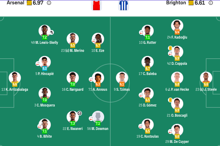 อาร์เซนอล ตัวจริง: 13-เคปา, 4-เบน ไวท์ (70' 12-ทิมเบอร์), 3-มอสโคล่า, 5-อินคาปี (70' 6-กาเบรียล), 49-สกายลี, 16-นอร์การ์ด, 23-เมรีโน่,22-เอ็นวาเนรี, 56-ดอว์สัน (70' 7-ซาก้า), 10-เอเซ่ (84' 19-ทรอสซาร์ด), 71-อันนุส (77' 41-ไรซ์).