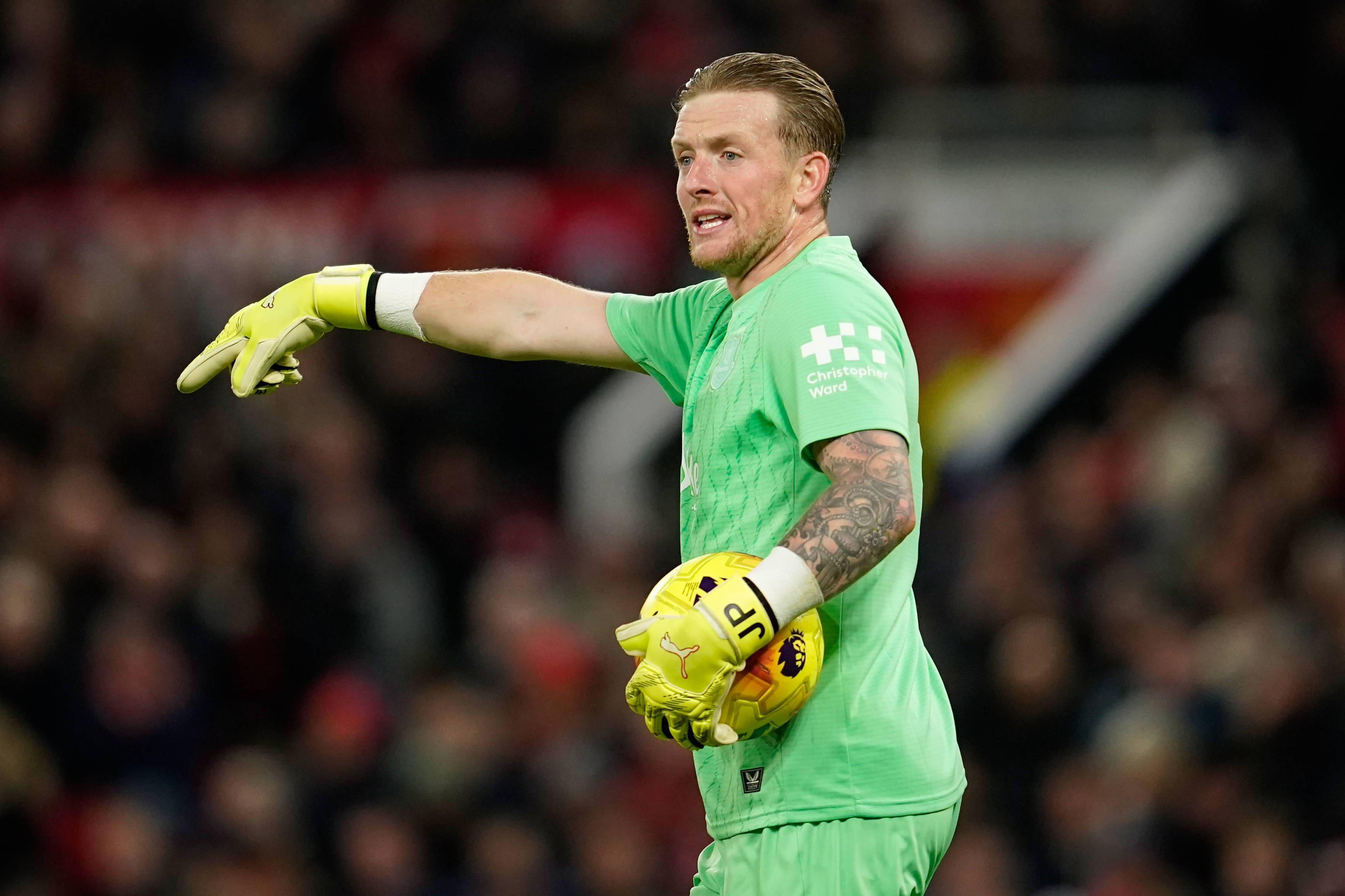 24 พฤศจิกายน: จอร์แดน พิคฟอร์ด ผู้รักษาประตูของเอฟเวอร์ตัน กำลังลงเล่นในระหว่างการแข่งขัน. ซินหัว/เอพี
