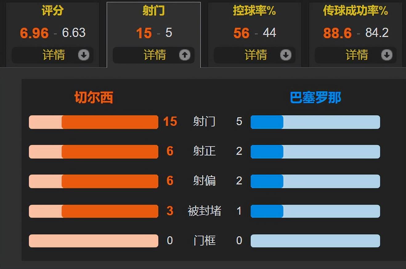 สถิติการแข่งขันยิ่งตอกย้ำความเหนือชั้นของเชลซีเหนือบาร์เซโลนาอย่างชัดเจน ในด้านของการครองบอล ซึ่งโดยปกติแล้วเป็นจุดเด่นของทีมจากแคว้นกาตาลัน เชลซีครองบอลได้ถึง 56% เมื่อเทียบกับบาร์เซโลนาที่ทำได้เพียง 44% เชลซียังยิงทั้งหมด 15 ครั้ง ซึ่งมากกว่าบาร์เซโลนาถึงสามเท่า โดยในจำนวนนั้นเป็นการยิงตรงกรอบ 6 ครั้ง ซึ่งมากกว่าบาร์เซโลนาถึงสามเท่าเช่นกัน