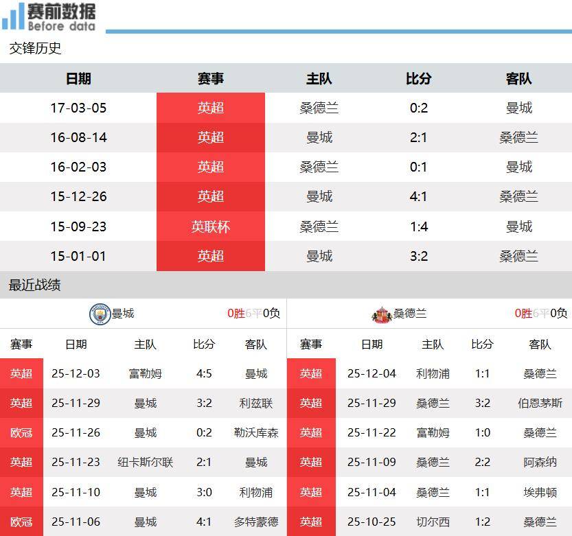 เวลา 23:00 น. ตามเวลาปักกิ่ง วันที่ 6 ธันวาคม แมนเชสเตอร์ ซิตี้ จะเปิดบ้านรับการมาเยือนของซันเดอร์แลนด์ ในนัดที่ 15 ของพรีเมียร์ลีก. CCTV5+ จะถ่ายทอดสดการแข่งขัน.