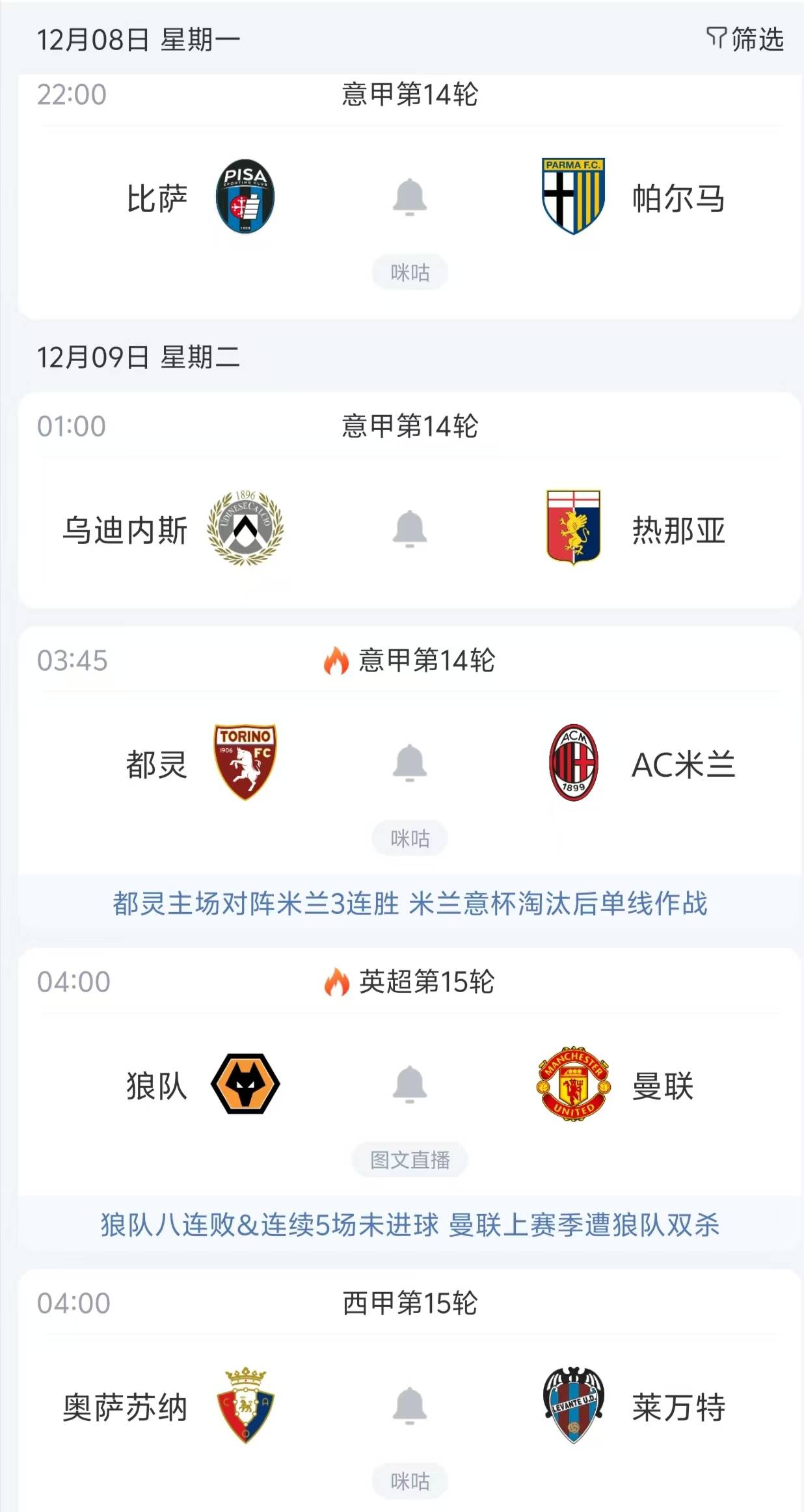 ให้เราตรวจสอบการแข่งขันทั้งห้าครั้งนี้อย่างละเอียด. เวลา 22:00 น. ตามเวลาปักกิ่ง, ปิซา จะพบกับปาร์มา. ปิซา, ซึ่งมีมูลค่าทีมอยู่ที่ 96 ล้านยูโร, ปัจจุบันอยู่ในอันดับที่ 18 ของตาราง. ในฐานะทีมที่เพิ่งเลื่อนชั้นขึ้นมา, ผลงานของพวกเขานั้นย่ำแย่มาก, ทำให้พวกเขากลายเป็นหนึ่งในทีมเต็งที่จะตกชั้น.หลังจากผ่านไป 13 นัด พวกเขาสามารถเก็บชัยชนะได้เพียงนัดเดียว เสมอ 7 นัด และแพ้ 5 นัด ชัยชนะเพียงนัดเดียวของพวกเขามาจากการเล่นในบ้าน โดยเอาชนะทีมที่เพิ่งเลื่อนชั้นมาด้วยกันอย่างเครโมเนเซ่ 1-0 ในบรรดาการเสมอ 7 นัดของพวกเขา มี 3 นัดที่จบลงด้วยสกอร์ 0-0, 3 นัดที่จบลงด้วยสกอร์ 2-2 และ 1 นัดที่จบลงด้วยสกอร์ 1-1