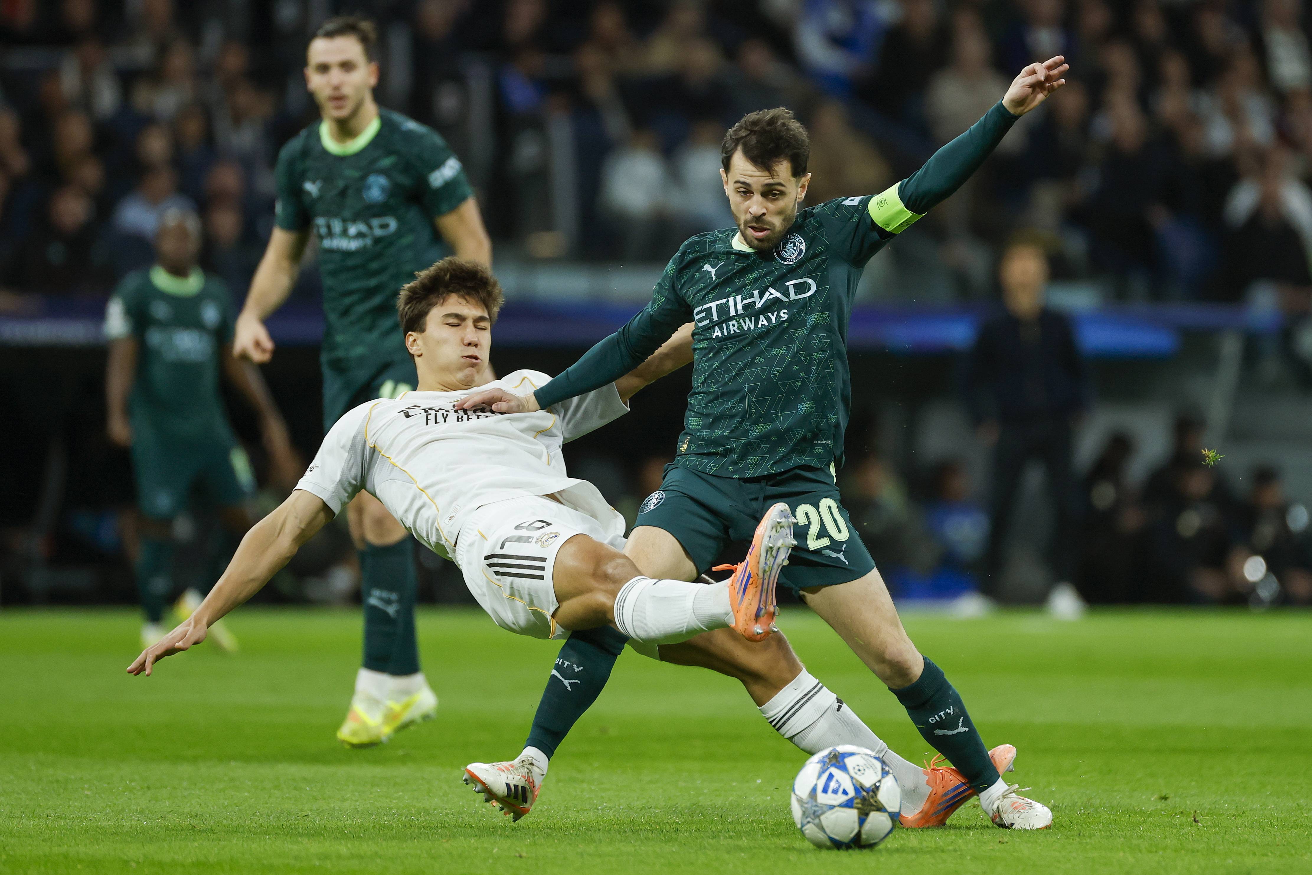 เมื่อวันที่ 10 ธันวาคม ซิลวาของแมนเชสเตอร์ ซิตี้ (ซ้าย) เข้าปะทะกับเบลลิงแฮมของเรอัล มาดริด เพื่อแย่งบอล ซีเอ็นเอ/อีพีเอ