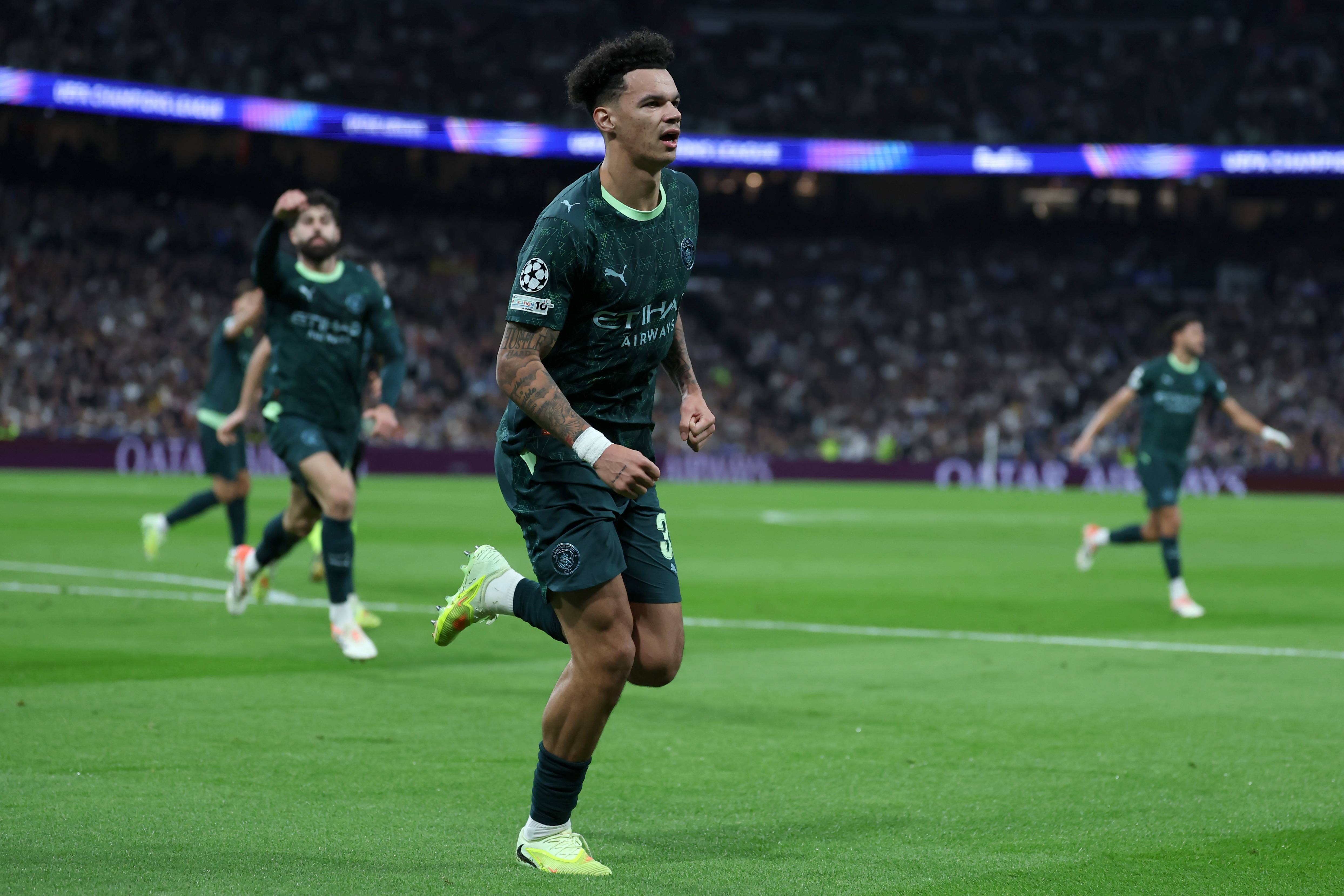 เมื่อวันที่ 10 ธันวาคม เออร์ลิง ฮาแลนด์ ของแมนเชสเตอร์ ซิตี้ (กลาง) ท้าทาย อันโตนิโอ รูดิเกอร์ ของเรอัล มาดริด (ซ้าย) ระหว่างการแข่งขัน ซีเอ็นเอ็น/อีพีเอ