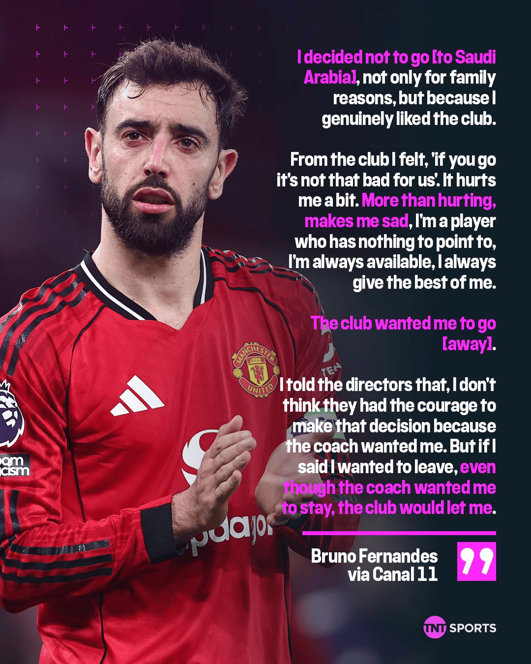 หลังจากปฏิเสธข้อเสนอสัญญาฉบับมหึมาจากซาอุดีอาระเบีย ความสัมพันธ์ระหว่างบรูโน่ แฟร์นันด์สกับสโมสรของเขากลับไม่ดีขึ้น ตรงกันข้าม กลับยิ่งห่างเหินมากขึ้นเรื่อย ๆ
