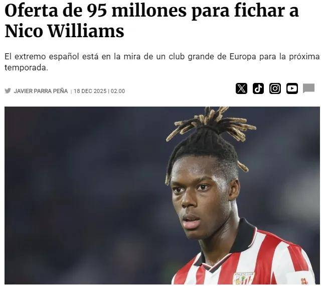 ความเร็วและการวิ่งเจาะทะลุของหลุยส์ ดิอาซ ตอนนี้กลายเป็นของบาเยิร์น มิวนิคแล้ว ทำให้ลิเวอร์พูลต้องรีบหาตัวแทนอย่างเร่งด่วน ตามรายงานจากสื่อสเปน ฟิชาเจส ระบุว่า FSG (เฟนเวย์ สปอร์ตส์ กรุ๊ป) กำลังเตรียมข้อเสนอ 95 ล้านยูโรเพื่อยื่นให้กับแอธเลติก บิลเบา โดยมีเป้าหมายเป็นนิโค วิลเลียมส์ นักเตะดาวรุ่งชาวสเปนวัย 23 ปี