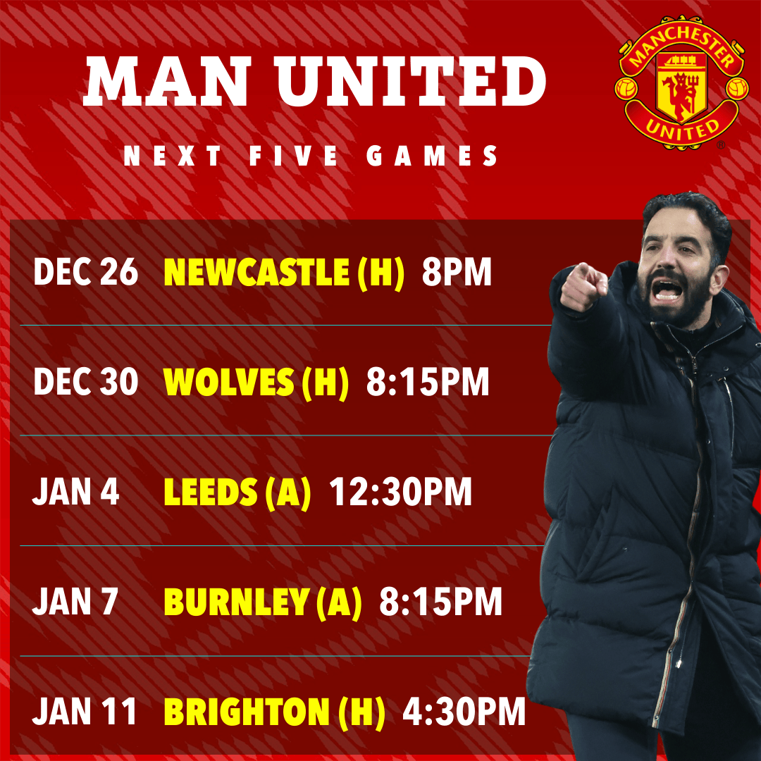 เมโน่ได้รับบาดเจ็บที่น่อง ซึ่งหมายความว่า อโมลินวัย 40 ปี จะมีกองกลางตัวจริงเพียงสองคนเท่านั้นสำหรับเกมวันที่ 26 ธันวาคมที่จะพบกับนิวคาสเซิล คาเซมิโร่จะกลับมาจากการติดโทษแบน ขณะที่ตัวเลือกอื่นคือ อูการ์เต้ ซึ่งได้ลงเล่นแทน "เสืออ้วน" ที่ติดโทษแบนที่วิลล่า พาร์ค และเป็นตัวจริงเป็นครั้งแรกในรอบสามเดือน อย่างไรก็ตาม ยูไนเต็ดแพ้ทุกนัดในฤดูกาลนี้ที่อูการ์เต้ได้ลงเป็นตัวจริง