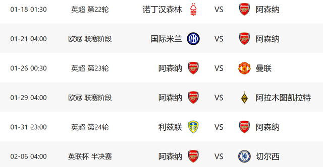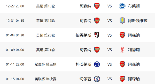 ตามตารางการแข่งขัน ตั้งแต่สุดสัปดาห์นี้จนถึงต้นเดือนกุมภาพันธ์ - ระยะเวลาประมาณ 41 วัน - อาร์เซนอลจะต้องลงแข่งขัน 12 นัด ซึ่งหมายความว่าทีมปืนใหญ่จะต้องลงเล่นในกลางสัปดาห์ทุกสัปดาห์ ในพรีเมียร์ลีก พวกเขาจะต้องพบกับไบรท์ตัน ทีมที่ขึ้นชื่อเรื่องการเอาชนะทีมใหญ่ ตามด้วยการปะทะกับแอสตัน วิลล่า ซึ่งปัจจุบันอยู่ในสามอันดับแรกของลีก จากนั้นเป็นการแข่งขันนอกบ้านกับบอร์นมัธ ก่อนที่จะพบกับลิเวอร์พูลในการแข่งขันที่มีความสำคัญสูง
