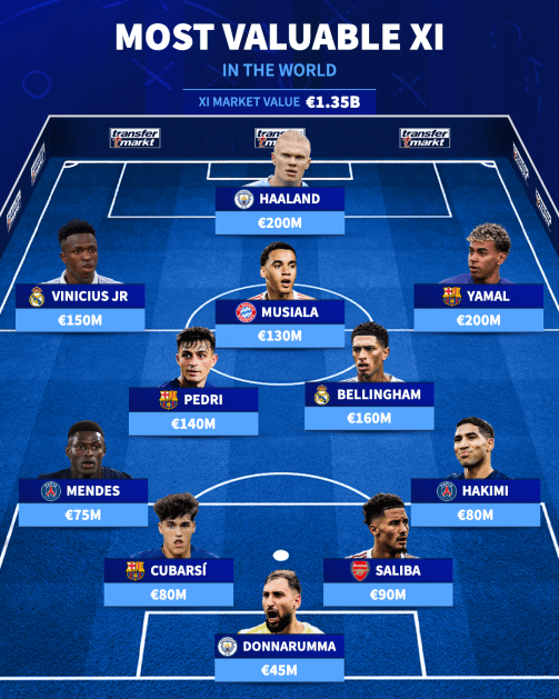 กองหน้า: ยาร์มัล (บาร์เซโลนา, 200 ล้านยูโร); ฮาแลนด์ (แมนเชสเตอร์ ซิตี้, 200 ล้านยูโร); วินิซิอุส (เรอัล มาดริด, 150 ล้านยูโร)