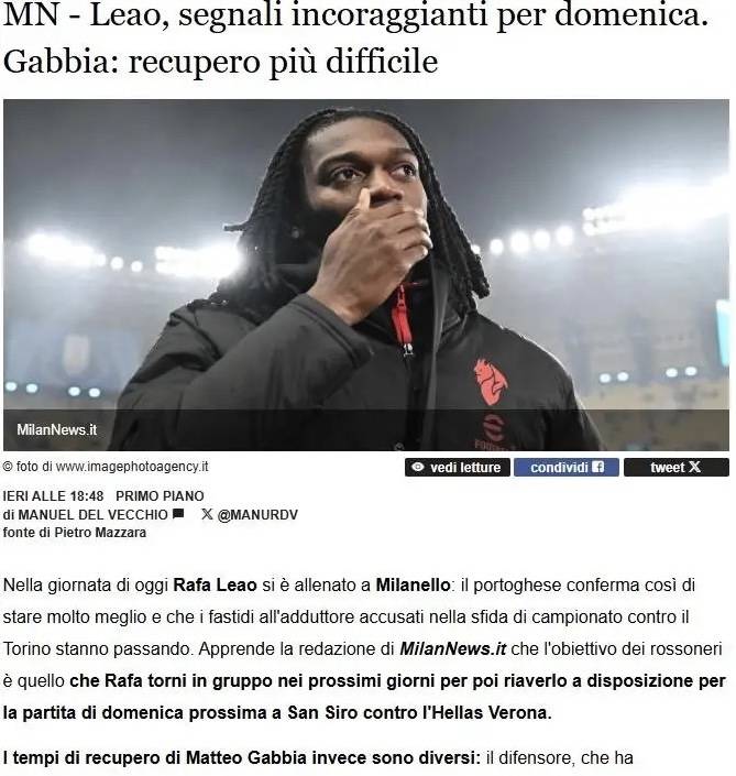 สถานการณ์การบาดเจ็บของเอซี มิลานในปัจจุบัน! ราฟาเอล เลเอา กำลังฟื้นตัวได้ดีมาก และมีแนวโน้มว่าจะสามารถกลับมาฝึกซ้อมเต็มรูปแบบกับทีมได้ในอีกไม่กี่วันข้างหน้า โดยความไม่สบายทางร่างกายก่อนหน้านี้ของเขาค่อยๆ ลดลงเรื่อยๆ เป้าหมายของรอสโซเนรีคือการให้เลเอาสามารถกลับมาฝึกซ้อมกับทีมเต็มรูปแบบในอีกไม่กี่วันข้างหน้า และพร้อมให้เลือกใช้ในนัดที่จะพบกับเฮลลาส เวโรนา