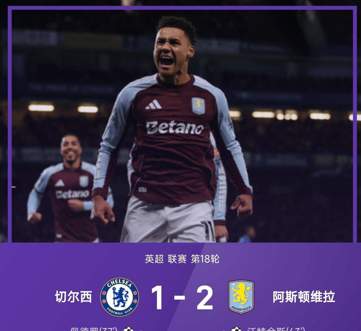 การแข่งขันระหว่างแอสตัน วิลล่า กับเชลซี เป็นการแข่งขันที่เต็มไปด้วยความตื่นเต้นเหมือนรถไฟเหาะ. ทีมเชลซีครองเกมอย่างสมบูรณ์ในครึ่งแรก ขณะที่วิลล่าไม่สามารถทำประตูได้เลยแม้แต่ครั้งเดียว ทำให้แฟนบอลแทบจะหมดหวัง.จากนั้นครึ่งหลังก็เริ่มขึ้น อูไน เอเมรี ส่ง มอร์แกน โรเจอร์ส วัย 23 ปี ลงสนาม ซึ่งเขาทำให้สนามสแตมฟอร์ด บริดจ์ เงียบลงทันทีด้วยการยิงโค้งสุดสวยจากระยะไกล เขาทำประตูที่สองได้เกือบจะในลักษณะเดียวกัน โดยตัดจากฝั่งซ้ายแล้วยิงโค้งทั้งสองประตูเข้ามุมไกล กองหลังดาวรุ่งของแมนเชสเตอร์ ยูไนเต็ด โยโร ถูกทำให้สับสนจนตั้งตัวไม่ทัน