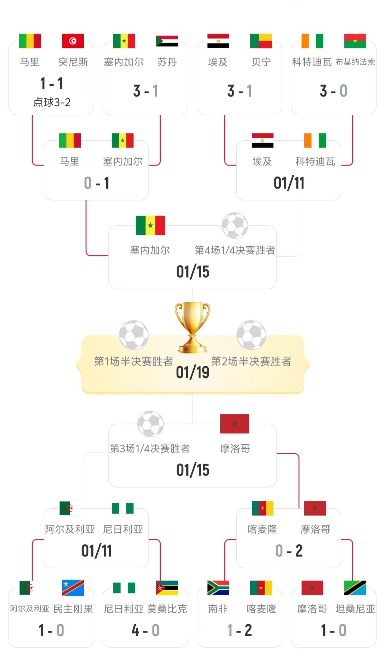 การแข่งขันรอบก่อนรองชนะเลิศของแอฟริกา คัพ สองคู่ได้เริ่มขึ้นเมื่อคืนที่ผ่านมา: มาลีพ่ายแพ้ให้กับเซเนกัล 0-1 ขณะที่แคเมอรูนพ่ายแพ้ให้กับโมร็อกโก 0-2 ม'บอมโบสามารถกลับมาที่แมนเชสเตอร์ ยูไนเต็ดได้ในที่สุด แต่กลับพบว่าผู้จัดการทีมได้เปลี่ยนไปแล้ว – จริงๆ แล้ว เวลาไม่เคยรอใครเวลา 00:00 น. ตามเวลาปักกิ่งของวันพรุ่งนี้ แอลจีเรียจะพบกับไนจีเรีย ผู้ชนะจะพบกับโมร็อกโกในรอบรองชนะเลิศ เวลา 03:00 น. อียิปต์จะพบกับโกตดิวัวร์ โดยผู้ชนะจะผ่านเข้าสู่รอบรองชนะเลิศเพื่อพบกับเซเนกัล