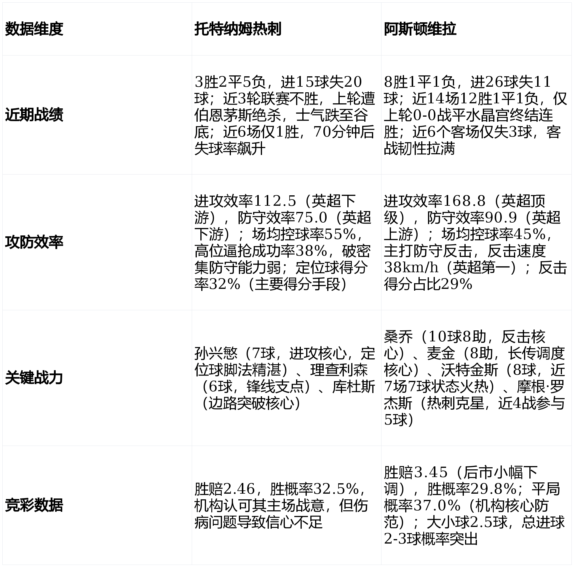 - 战术极致对冲:热刺高位逼抢+定位球攻坚VS维拉低位防反+快速冲击,维拉的反击体系能否再次精准打击热刺防线短板?