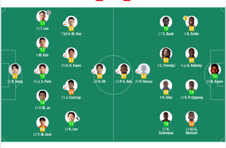 ในนาทีที่ 30 กานาได้ลูกฟรีคิกในแดนรุก ลูกบอลถูกโหม่งสกัดออกไป และซูเลย์มาน ซึ่งไม่ได้ทั้งเปิดบอลหรือยิงประตู ส่งบอลกลับคืนให้กับผู้รักษาประตูเกาหลีใต้
