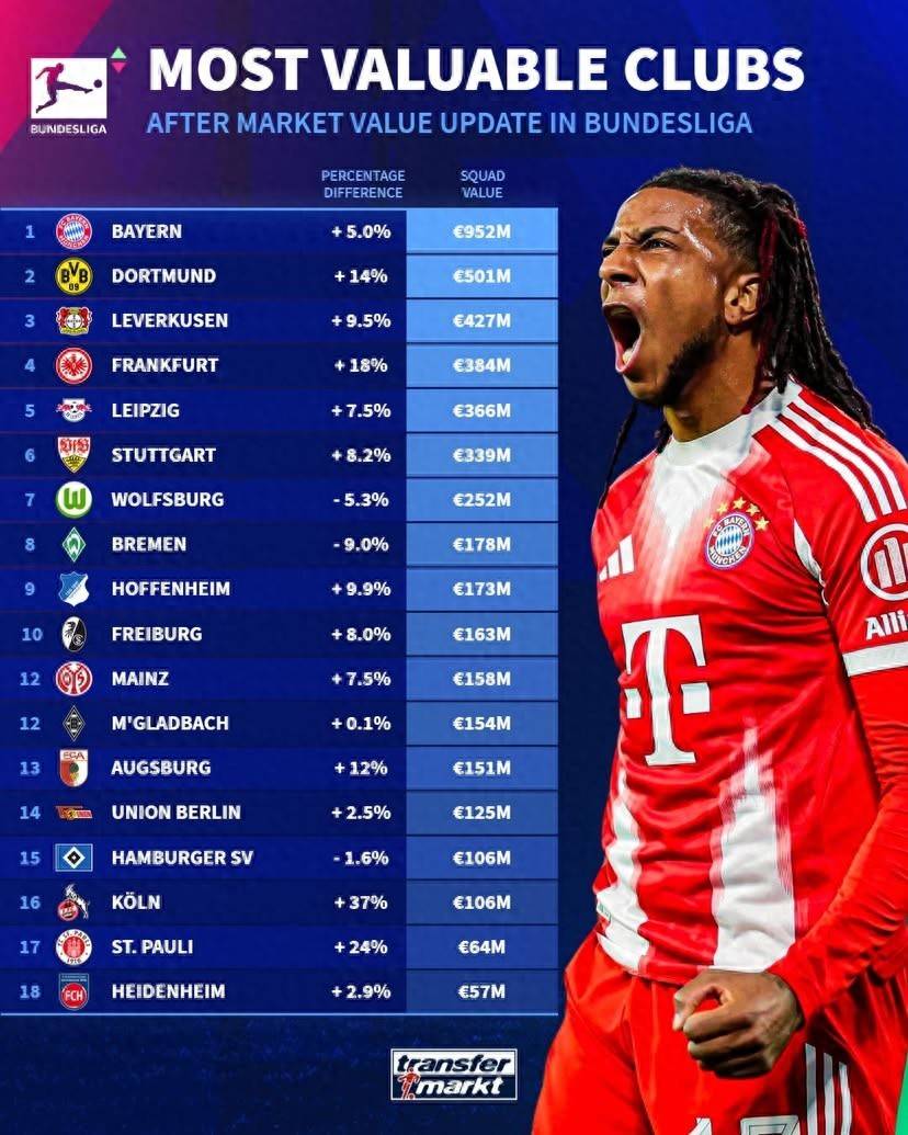 เมื่อวันที่ 14 ตุลาคม ภายหลังการอัปเดตเกี่ยวกับผู้เล่นบุนเดสลีกา Transfermarkt ก็ได้เผยแพร่การจัดอันดับมูลค่าสำหรับสโมสรบุนเดสลีกาเช่นกัน บาเยิร์น มิวนิก ครองอันดับหนึ่งด้วยมูลค่า 952 ล้านยูโร ตามมาด้วยโบรุสเซีย ดอร์ทมุนด์ ที่ 501 ล้านยูโร และไบเออร์ เลเวอร์คูเซน อยู่ในอันดับสามที่ 427 ล้านยูโร