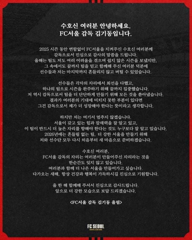 ในช่วงบ่ายของวันที่ 11 ผู้จัดการทีมเอฟซี โซล คิม กี-ดง ได้แสดงความขอบคุณต่อองค์กรผู้สนับสนุนของสโมสร 'โซล การ์เดียนส์' ผ่านช่องทางโซเชียลมีเดียอย่างเป็นทางการ นี่ถือเป็นการตอบสนองอย่างเป็นทางการของเขาต่อข่าวลือภายนอกเกี่ยวกับการเปลี่ยนแปลงผู้จัดการทีมที่อาจเกิดขึ้น คิมกล่าวว่า: "ในฐานะหัวหน้าโค้ช ผมขอขอบคุณโซล การ์เดียนส์อย่างสุดซึ้งสำหรับการสนับสนุนสโมสรอย่างมั่นคงตลอดทั้งฤดูกาล 2025ปีนี้ได้นำเสนอความท้าทายมากมายทั้งสำหรับทีมและตัวผมเอง ทำให้เป็นฤดูกาลที่ท้าทายอย่างมาก อย่างไรก็ตาม เป็นเพราะความไว้วางใจที่ไม่เปลี่ยนแปลงของคุณในทีมและการสนับสนุนอย่างมั่นคงของคุณนั่นเอง ที่ทำให้ผู้เล่นและผมสามารถอดทนจนถึงที่สุดโดยไม่มีการสะดุด ผู้เล่นได้ทุ่มเทอย่างเต็มที่ในบทบาทของตน แสดงให้เห็นถึงจิตวิญญาณของทีมที่แท้จริงจนถึงเสียงนกหวีดสุดท้ายในฐานะหัวหน้าผู้ฝึกสอน ผมเองก็ทุ่มเททุกอย่างเพื่อสร้างทีมที่แข็งแกร่งและยืดหยุ่นมากขึ้น หากผลลัพธ์สุดท้ายไม่เป็นไปตามที่คาดหวัง ผมมองว่านี่คือสัญญาณว่าผมในฐานะผู้จัดการทีมต้องพัฒนาตัวเองต่อไป