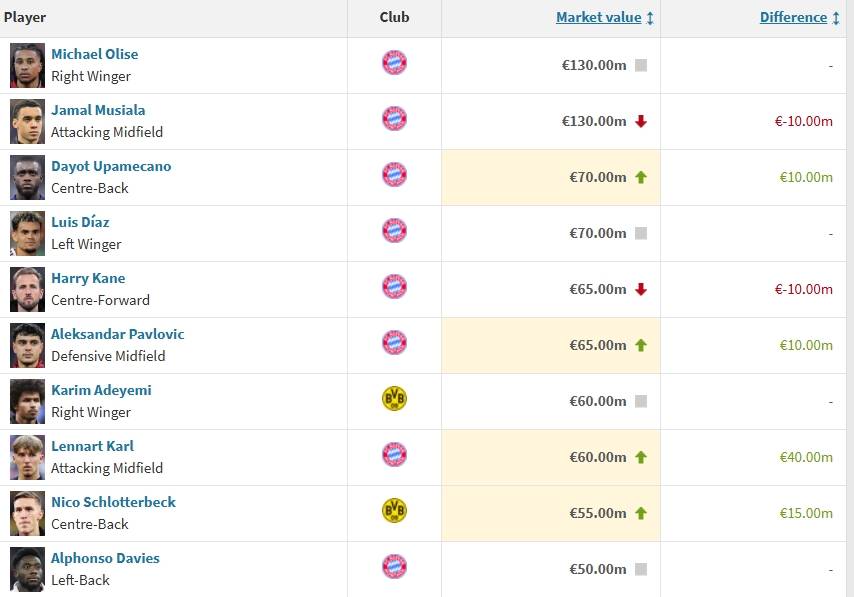 Transfermarkt ได้อัปเดตมูลค่าผู้เล่นบุนเดสลีกาเมื่อวันที่ 19 ธันวาคม โดยมิดฟิลด์ตัวรุกของบาเยิร์น มิวนิค จามาล มูเซียลา ซึ่งปัจจุบันต้องพักรักษาอาการบาดเจ็บ มีมูลค่าลดลง 10 ล้านยูโร เหลือ 130 ล้านยูโร เขายังคงครองอันดับร่วมกับโอดิออน อิกาโล ในฐานะผู้เล่นเพียงสองคนในลีกที่มีมูลค่ามากกว่า 100 ล้านยูโรในขณะเดียวกัน จามาล คิมมิช ดาวรุ่งวัย 17 ปีของบาเยิร์น มีมูลค่าพุ่งสูงขึ้นถึง 40 ล้านยูโร เมื่อมูเซียลาหายจากอาการบาดเจ็บกลับมา เขาอาจพบว่าตำแหน่งของเขาถูกแย่งชิงโดยดาวรุ่งพุ่งแรงคนนี้ ทั้งสองเล่นในตำแหน่งกองกลางตัวรุก แต่คิมมิชมีเกมรุกที่เฉียบคมกว่าและการจบสกอร์ที่แม่นยำกว่า