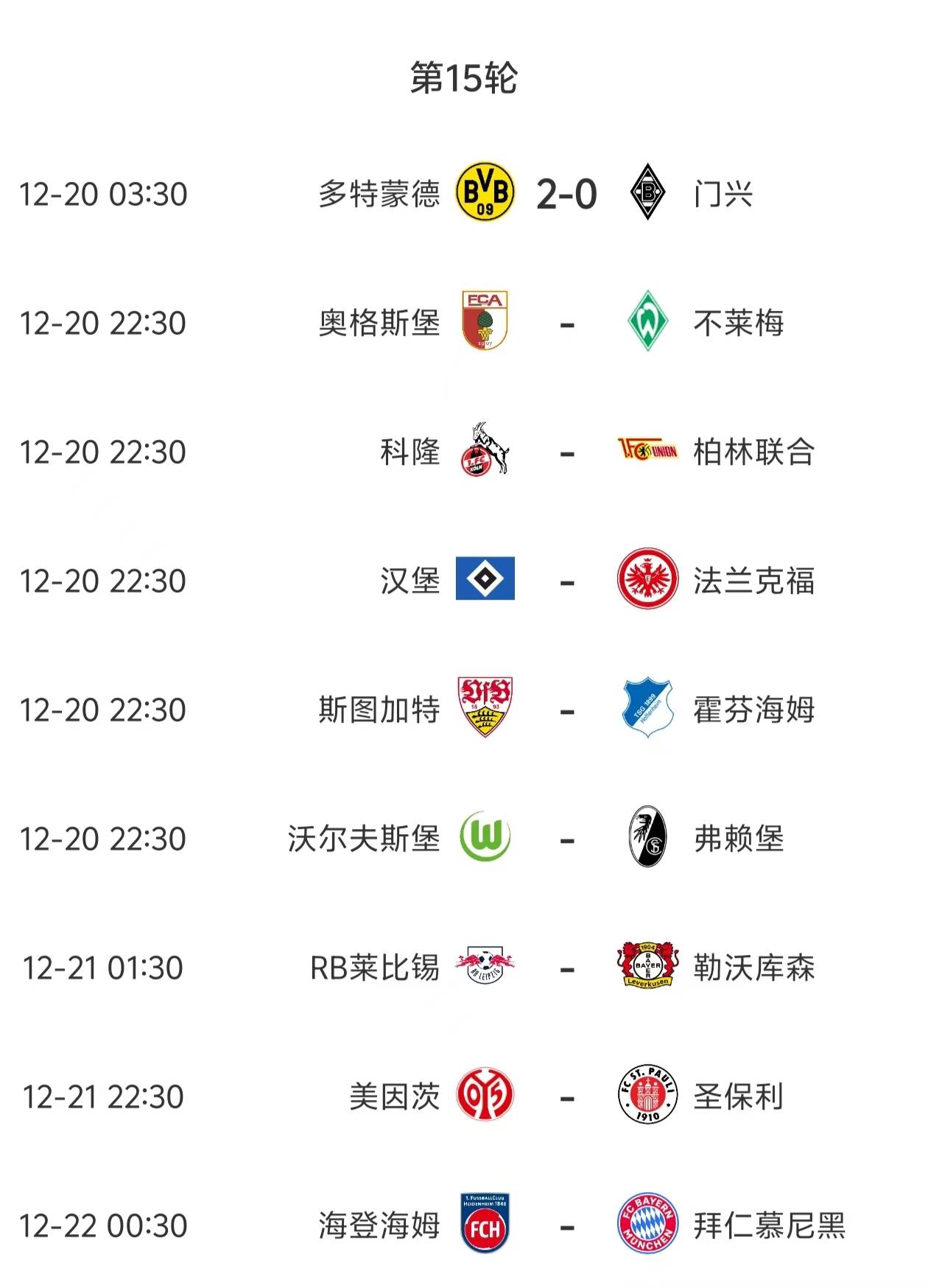 ดังนั้น แต่ละรอบของการแข่งขันบุนเดสลีกาจึงยังคงเต็มไปด้วยความสนุกสนานอย่างเต็มที่ เมื่อคืนที่ผ่านมาเป็นการแข่งขันนัดเปิดของรอบที่ 15 โดยดอร์ทมุนด์สามารถเอาชนะเมนเชนกลัดบัคได้ถึงบ้านด้วยสกอร์ 2-0 เมื่อเล่นเพียงนัดเดียวต่อสัปดาห์ ดอร์ทมุนด์ก็แทบจะไม่มีใครสามารถเอาชนะได้ มาดูการแข่งขันนัดอื่น ๆ อย่างละเอียดกันเถอะ
