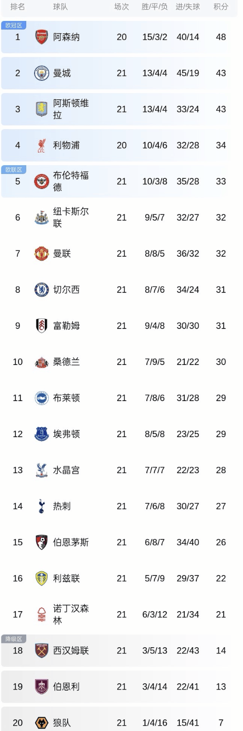 เมื่อวันที่ 8 มกราคม ตามเวลาปักกิ่ง การแข่งขันหลายคู่ในรอบที่ 21 ของพรีเมียร์ลีกได้สิ้นสุดลง โดยหลายสโมสรชั้นนำประสบความพ่ายแพ้อย่างไม่คาดคิดและเสียคะแนนไป ซึ่งส่งผลดีอย่างมากต่ออาร์เซนอล ที่พร้อมจะขยายช่องว่างและตั้งเป้าหมายคว้าแชมป์พรีเมียร์ลีก การพลิกโผครั้งใหญ่ห้าครั้งได้เขย่าพรีเมียร์ลีกในชั่วข้ามคืน! แมนเชสเตอร์ ซิตี้ ทำได้เพียงเสมอเป็นนัดที่สามติดต่อกัน ขณะที่การเปลี่ยนแปลงผู้จัดการทีมของแมนเชสเตอร์ ยูไนเต็ด และเชลซี กลับไม่ประสบผลสำเร็จ ทำให้ตารางคะแนนลีกเกิดความวุ่นวาย