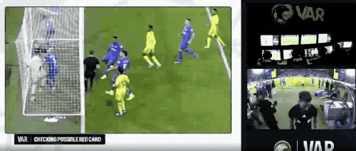 ผู้เล่นของอัล-นาสร์วิ่งเข้าหาตาข่ายเพื่อเก็บลูกบอล อาชิดีทำการท้าทายเพิ่มเติมกับเนเวส วีเออาร์เข้ามาแทรกแซง ทำให้ผู้ตัดสินกลับคำตัดสินและแจกใบแดงโดยตรงให้กับอาชิดี