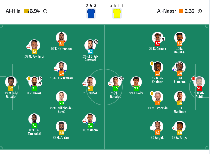 ผู้เล่นตัวจริง อัล-นาสร์: 17-โมฮัมเหม็ด อัล-ยามิ, 88-ฮามัด อัล-ยามิ, 87-แทมบาติ (98' 78-ราจามิ), 24-ฮัลบี (76' 30-ปาโบล มาริ)19-ธีโอ แอร์นานเดซ, 16-นัสเซอร์ อัล-ดาวซารี (76' 28-คานู), 8-รูเบน เนเวส, 22-มิลินโควิช, 29-อัล-ดาวซารี, 10-มัลคอม (92' 9-เลโอนาร์โด), 7-นูเญซ (93' 23-มันดาช).