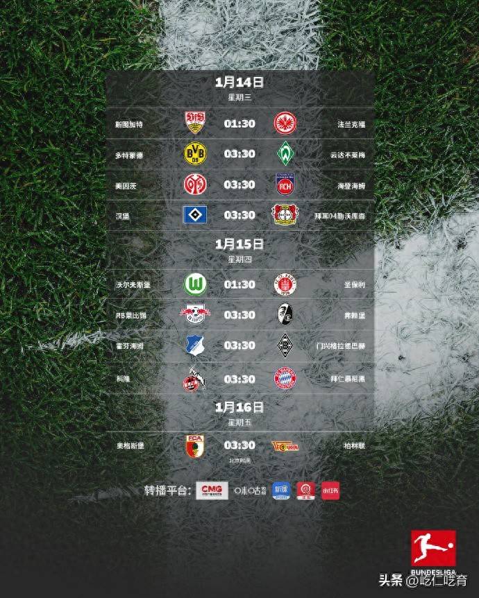 ตั้งแต่เวลา 01:30 น. ของวันที่ 14 มกราคม ถึงเวลา 03:30 น. ของวันที่ 16 มกราคม ตามเวลาปักกิ่ง รอบสุดท้ายของครึ่งแรกของฤดูกาลบุนเดสลีกาจะมีการแข่งขันทั้งหมดเก้านัดในช่วงกลางสัปดาห์ ในรอบนี้ สตุ๊ตการ์ทจะเป็นเจ้าบ้านต้อนรับไอน์ทรัค แฟรงค์เฟิร์ต ขณะที่โบรุสเซีย ดอร์ทมุนด์จะเปิดบ้านต้อนรับแวร์เดอร์ เบรเมน ส่วนบาเยิร์น มิวนิคและไบเออร์ เลเวอร์คูเซ่นจะต้องออกไปเยือนโคโลญจน์และแฮร์ธ่า เบอร์ลินตามลำดับ