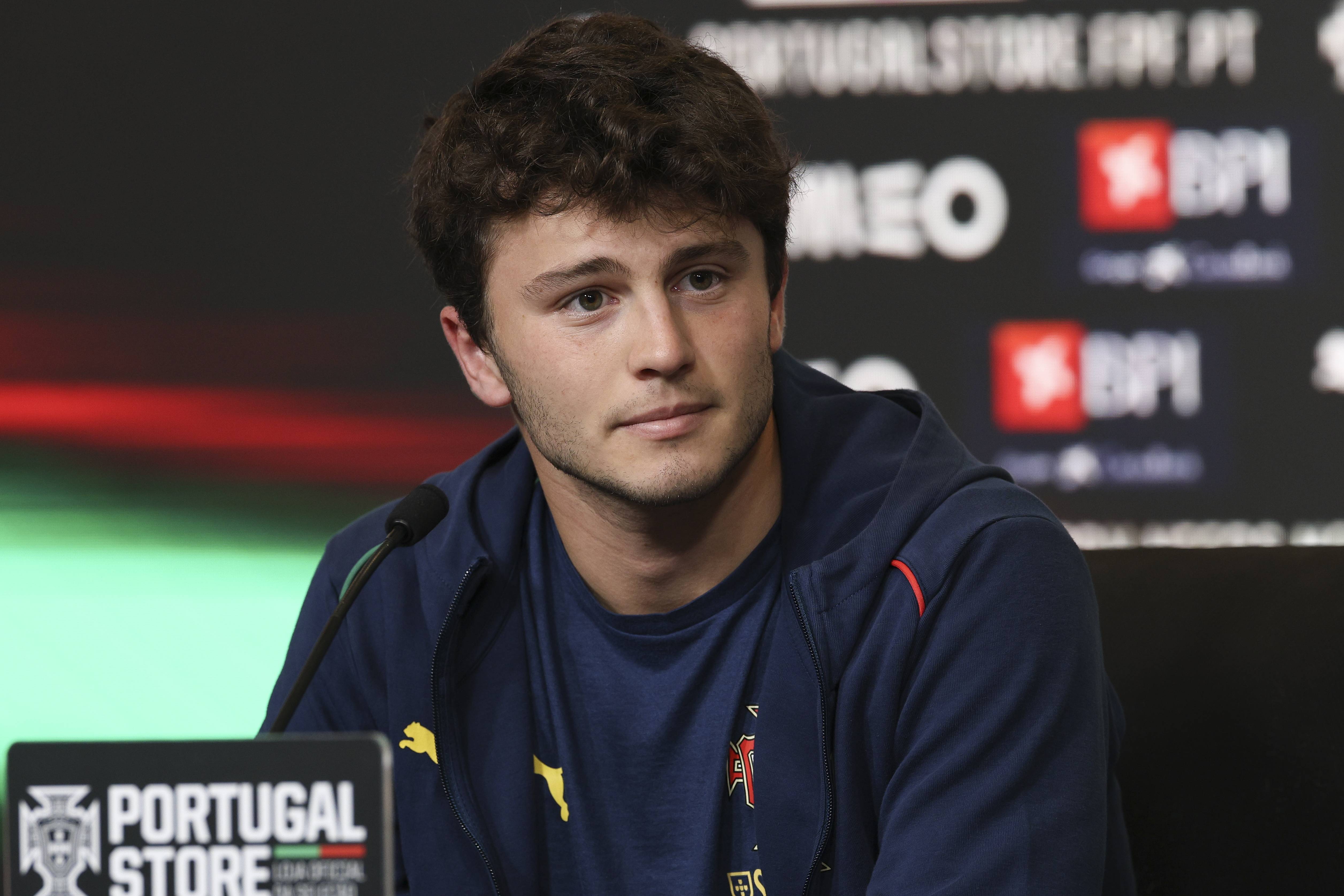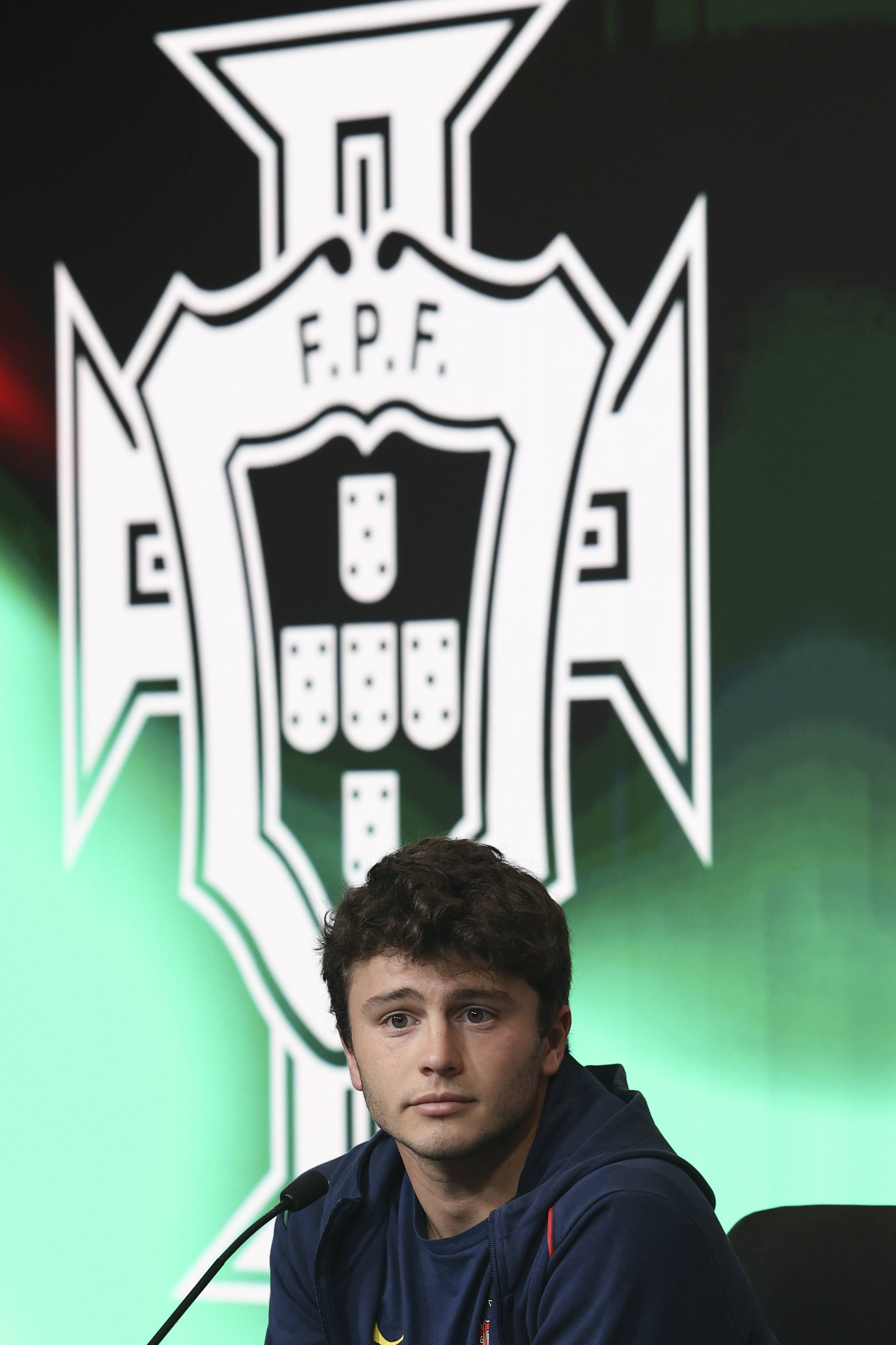 เมื่อวันที่ 10 พฤศจิกายน นักฟุตบอลทีมชาติโปรตุเกส João Neves เข้าร่วมงานแถลงข่าว Xinhua/EFE