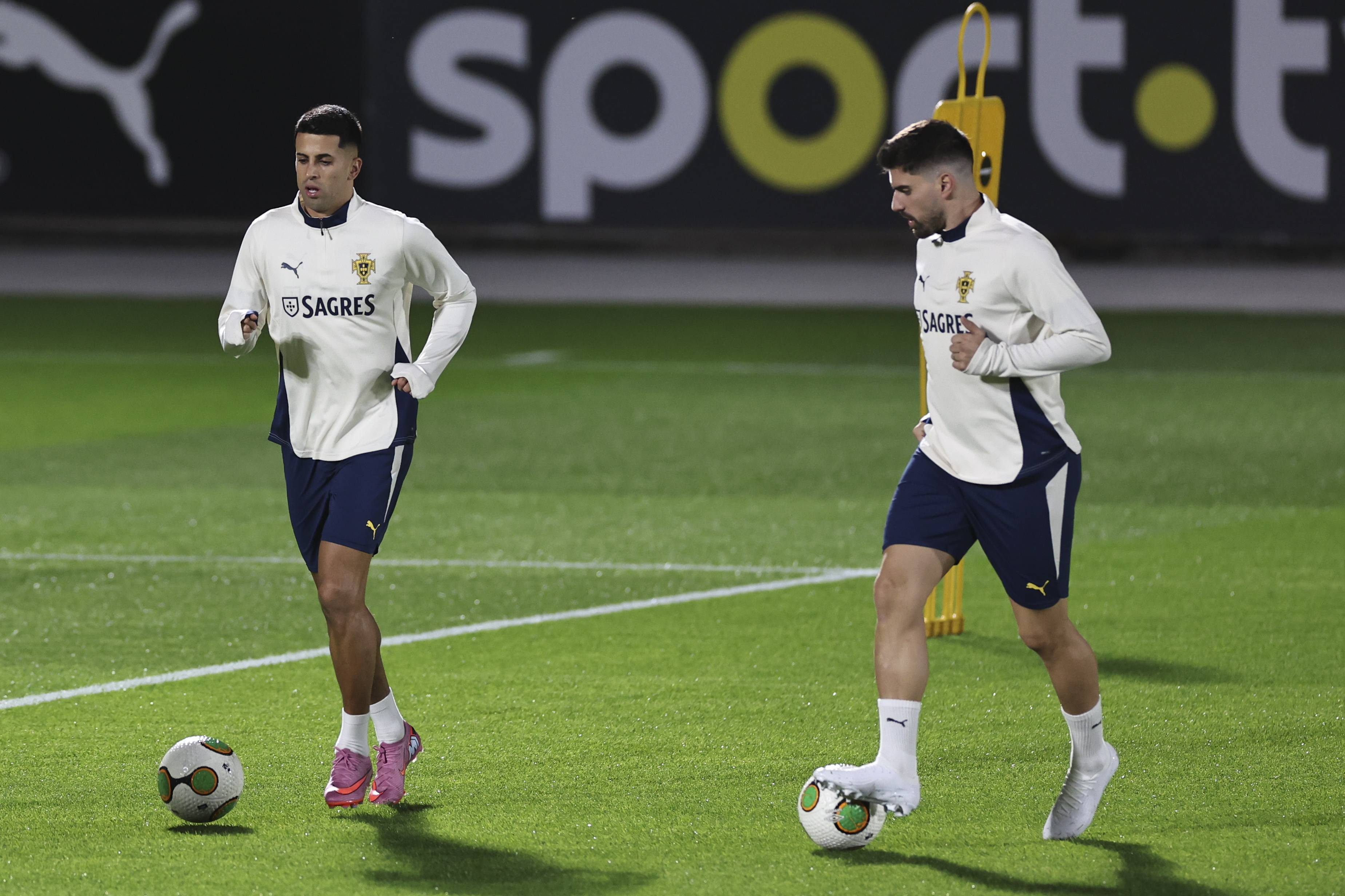 เมื่อวันที่ 10 พฤศจิกายน นักเตะทีมชาติโปรตุเกส รูเบน เนเวส (ขวา) และดิโอโก ดาโลต์ ระหว่างการฝึกซ้อม ซินหัว/EPA