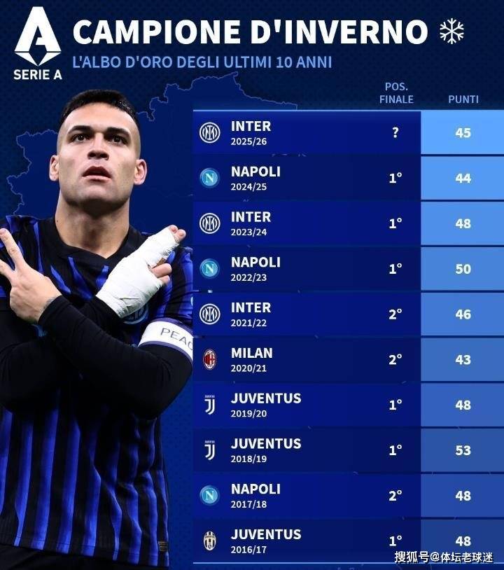 อินเตอร์ มิลาน คว้าแชมป์กัลโช่ เซเรีย อา กลางฤดูกาล! ในช่วงเช้าตรู่ของวันที่ 15 มกราคม ตามเวลาปักกิ่ง การแข่งขันกัลโช่ เซเรีย อา นัดสำคัญในรอบที่ 16 ได้จัดขึ้นที่สนามซานซิโร่ในที่สุด อินเตอร์ มิลาน ก็สามารถคว้าชัยชนะอย่างยากลำบากในบ้านเหนือ เลชเช ด้วยสกอร์ 1-0 ได้สำเร็จ โดยประตูชัยเกิดขึ้นในนาทีที่ 78 จากฝีเท้าของ เปียว เอสโปซิโต นักเตะจากอคาเดมีของสโมสร ด้วยคะแนน 46 คะแนน (ชนะ 15 นัด เสมอ 1 นัด แพ้ 4 นัด) ทำให้พวกเขารั้งตำแหน่งจ่าฝูงของตารางกัลโช่ เซเรีย อา อย่างมั่นคง โดยมีคะแนนนำหน้า เอซี มิลาน และ นาโปลี อยู่ 6 คะแนน – ทั้งสองทีมลงเล่นน้อยกว่า 1 นัด – พร้อมกับการครองแชมป์กัลโช่ เซเรีย อา กลางฤดูกาล