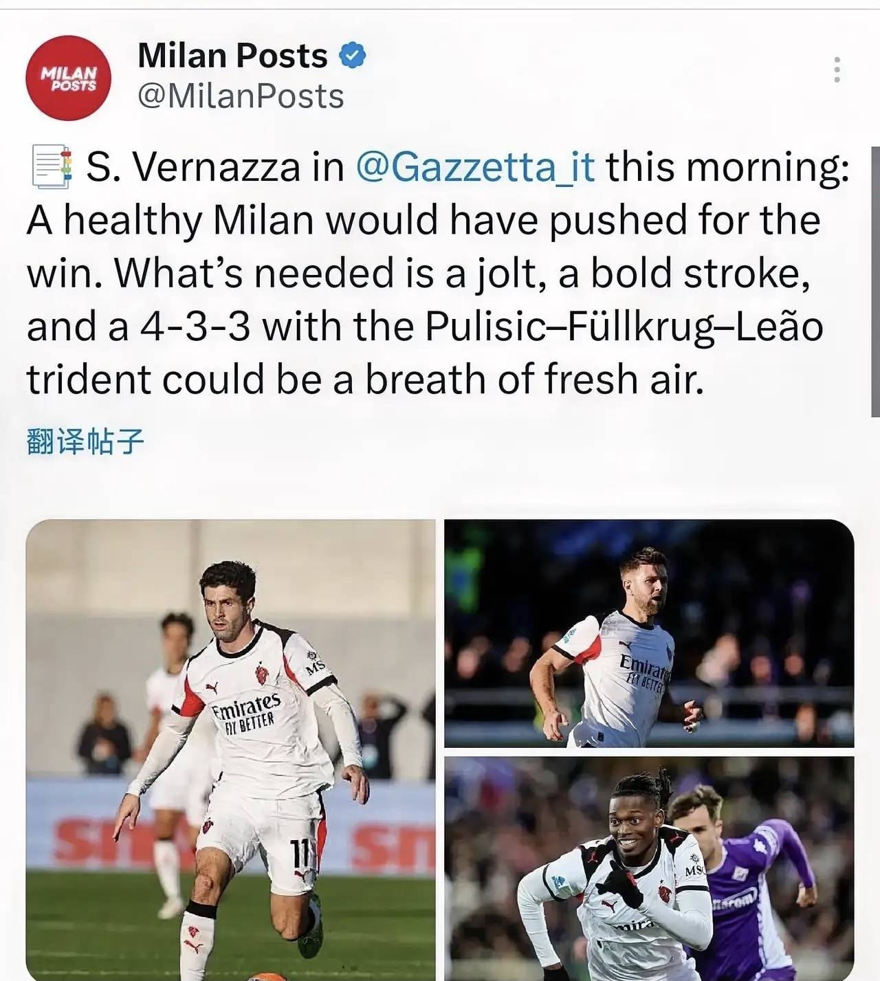 กูรูชาวอิตาลีแนะนำว่ามิลานควรเปลี่ยนมาใช้ระบบ 4-3-3 เพื่อพลิกสถานการณ์ที่ทีมกำลังตกต่ำอยู่ในขณะนี้ด้วยชัยชนะและเพื่อเสริมสร้างขวัญกำลังใจพูดตามตรง ฉันรู้สึกงงงวยกับความคิดเห็นของผู้วิจารณ์เหล่านี้ในแต่ละวัน หากพวกเขาเข้าใจมิลานจริงๆ พวกเขาจะรู้ว่าทีมไม่สามารถจัดรูปแบบ 4-3-3 ได้ในตอนนี้ ด้วยเลเอาที่บาดเจ็บ, ซาลีมาร์กเกอร์ที่ไม่เหมาะกับการเล่นปีก, และฟิลครูเกอร์กองหน้าที่บาดเจ็บอีกคน แล้วมิลานจะส่งใครลงเล่นเพื่อยึดตำแหน่งในแผน 4-3-3 นี้?
