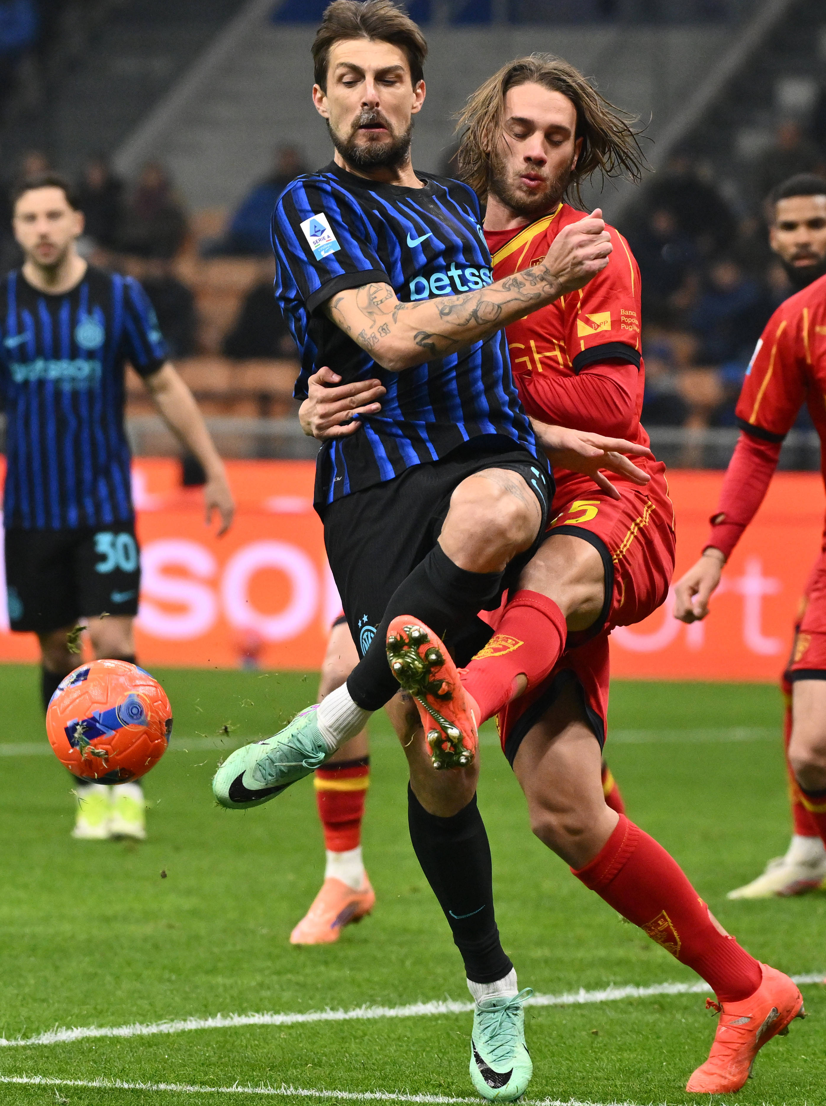เมื่อวันที่ 14 มกราคม บารェลล่า ของอินเตอร์ มิลาน (บน) ท้าทาย มาเล็ค ของเลชเช่ ระหว่างการแข่งขัน. สำนักข่าวซินหัว (ภาพโดย อัลเบร์โต้ ลิงเกีย)