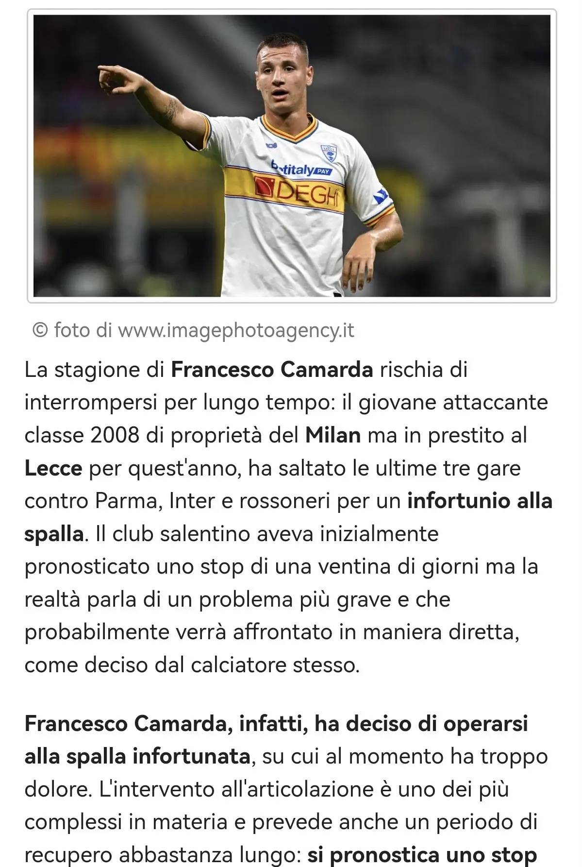 ฤดูกาลของฟรานเชสโก คามาร์ดา มีแนวโน้มว่าจะต้องหยุดชะงักเป็นระยะเวลานาน: กองหน้าดาวรุ่งที่เกิดในปี 2008 และเป็นนักเตะของเอซี มิลาน ได้ถูกปล่อยยืมตัวให้กับเลชเชในฤดูกาลนี้ เขาพลาดการแข่งขันล่าสุดกับปาร์มา, อินเตอร์ มิลาน และเอซี มิลาน เนื่องจากอาการบาดเจ็บที่ไหล่ สโมสรซาลันโตคาดการณ์ในตอนแรกว่าเขาจะพักประมาณยี่สิบวัน แต่ความรุนแรงของอาการบาดเจ็บนั้นมากกว่าที่คาดไว้ นักเตะเองได้ตัดสินใจเข้ารับการผ่าตัดเพื่อแก้ไขปัญหาโดยตรง