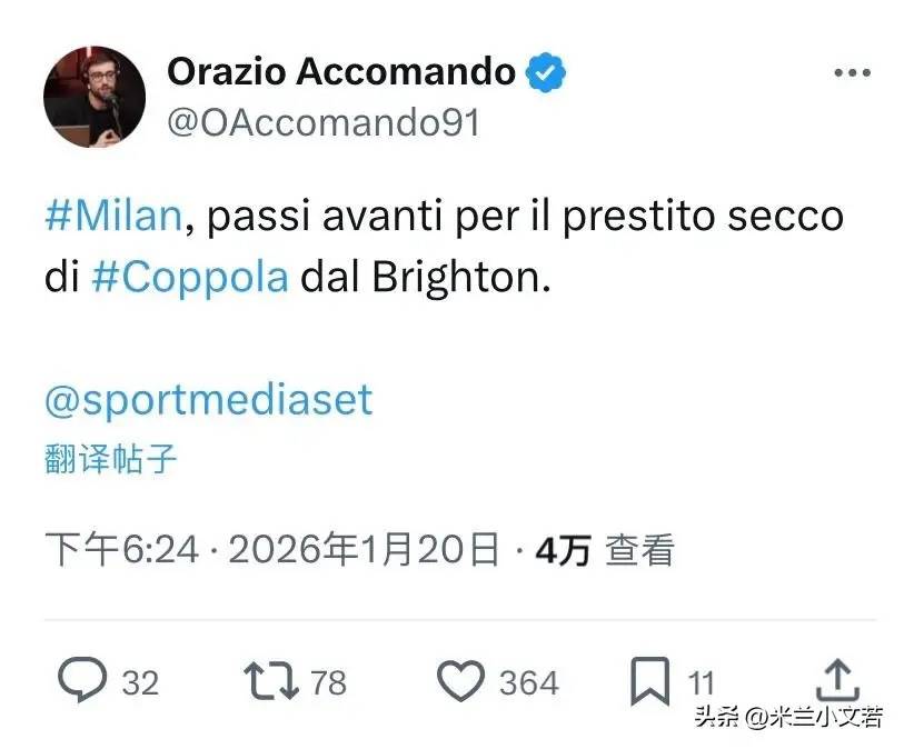 ดิเอโก้ โคโปล่า! มิลานกำลังเจรจากับไบรท์ตันเกี่ยวกับกองหลังชาวอิตาลี ดิเอโก้ โคโปล่า ซึ่งพวกเขาได้เล็งไว้ในช่วงตลาดซื้อขายนักเตะฤดูร้อนที่ผ่านมา โคโปล่าคนนี้เป็นนักเตะที่ผมมีความหวังสูงมาก และผมก็อยากให้เราได้ตัวเขามาในช่วงฤดูร้อนเป็นพิเศษ แต่ไบรท์ตันก็คว้าตัวเขาไปในราคาที่คุ้มค่า รายงานระบุว่าไบรท์ตันเปิดรับฟังข้อเสนอจากสโมสรอื่น ๆ สำหรับดิเอโก้ โคโปล่า