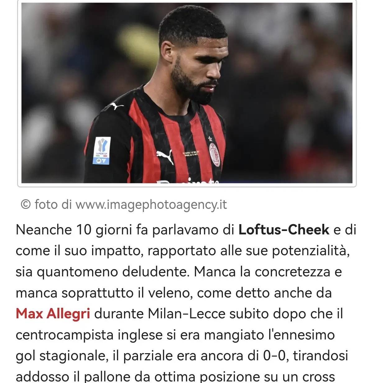 เมื่อไม่ถึงสิบวันที่ผ่านมา เรายังคงพูดคุยเกี่ยวกับลอฟตัส-ชีคอยู่เลย—เมื่อพิจารณาจากพรสวรรค์ของเขาแล้ว ผลงานในสนามถือว่าน่าผิดหวังเป็นอย่างยิ่งเขาขาดทั้งประสิทธิภาพในการจบสกอร์และสัญชาตญาณนักฆ่าที่จะโจมตีอย่างเด็ดขาด ในเกมที่มิลานพบกับเลชเช่ ขณะที่สกอร์ยังเสมอกันอยู่ 0-0 กองกลางชาวอังกฤษได้พลาดโอกาสอีกครั้งในการเพิ่มสถิติการทำประตูของตัวเองในฤดูกาลนี้ เมื่อเขาได้รับบอลจากจังหวะเปิดข้ามมาในตำแหน่งที่ยอดเยี่ยมจากริมเส้น แต่กลับไม่สามารถเปลี่ยนให้เป็นประตูได้ อัลเลกรีได้กล่าวถึงประเด็นนี้อย่างชัดเจนหลังจบการแข่งขัน