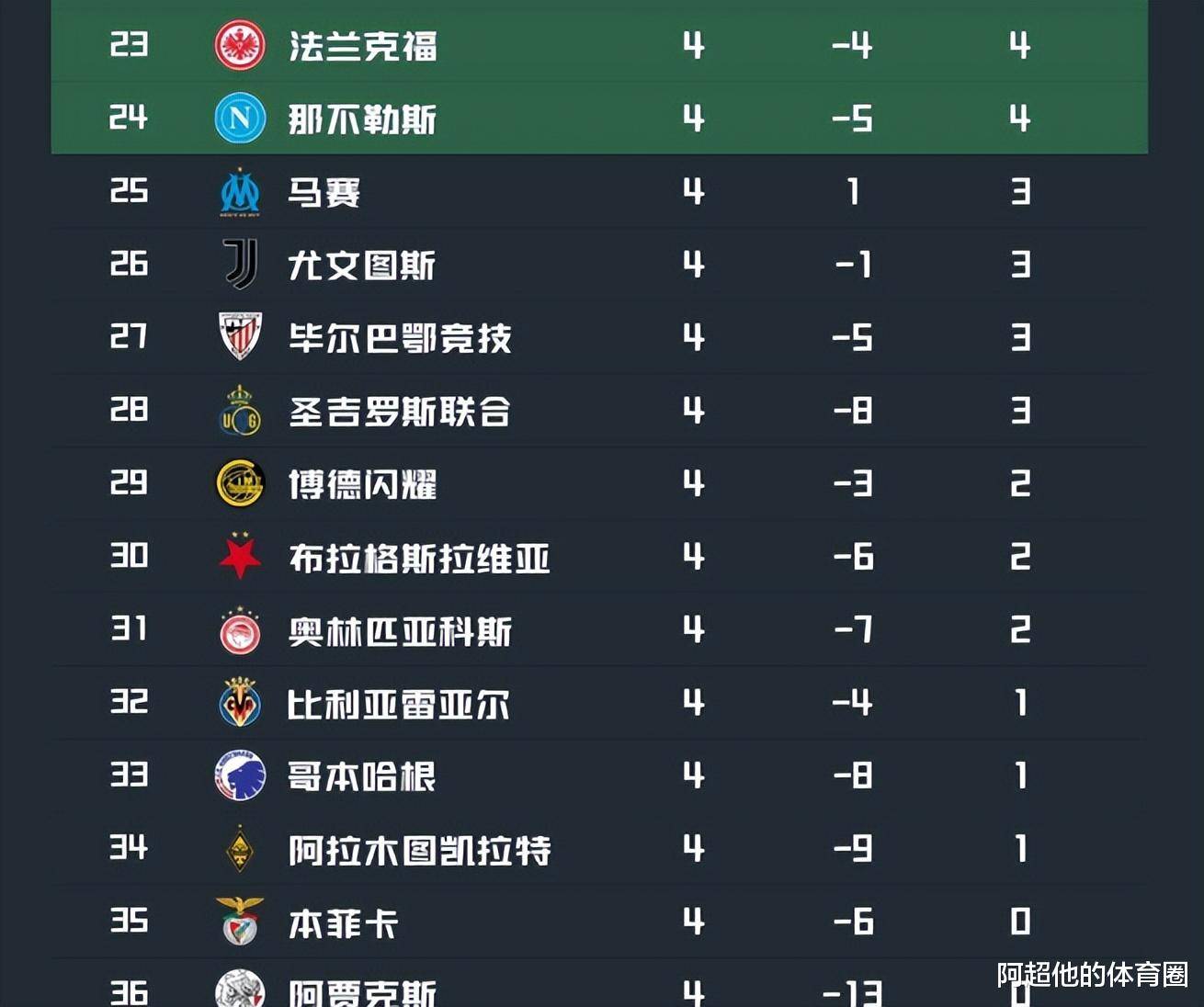 อย่างไรก็ตาม ทีมอื่น ๆ ในเซเรียอาทำผลงานได้ไม่น่าประทับใจเท่ากันมากนัก อาตาลันตาอยู่ในอันดับที่ 16 มี 7 คะแนน เป็นทีมอิตาลีที่มีอันดับสูงที่สุดรองจากอินเตอร์ มิลาน ฤดูกาลที่แล้ว นาโปลี แชมป์เก่า ต้องเผชิญกับฤดูกาลที่น่าผิดหวัง โดยพ่ายแพ้ให้กับพีเอสวี ไอนด์โฮเฟ่น 6-2 ในรอบที่ผ่านมา หลังจากผ่านไป 4 นัด พวกเขารั้งอยู่ในอันดับที่ 24 มีเพียง 4 คะแนน และหลุดเข้าไปอยู่ในโซนเพลย์ออฟหนีการตกชั้นฟอร์มของยูเวนตุสย่ำแย่ยิ่งกว่าเดิม โดยไม่สามารถคว้าชัยชนะได้เลยแม้แต่เกมเดียวหลังจากลงสนามไปแล้วสี่นัด ขณะนี้พวกเขาอยู่ในอันดับที่ 26 ร่วงลงไปอยู่ในโซนตกชั้น