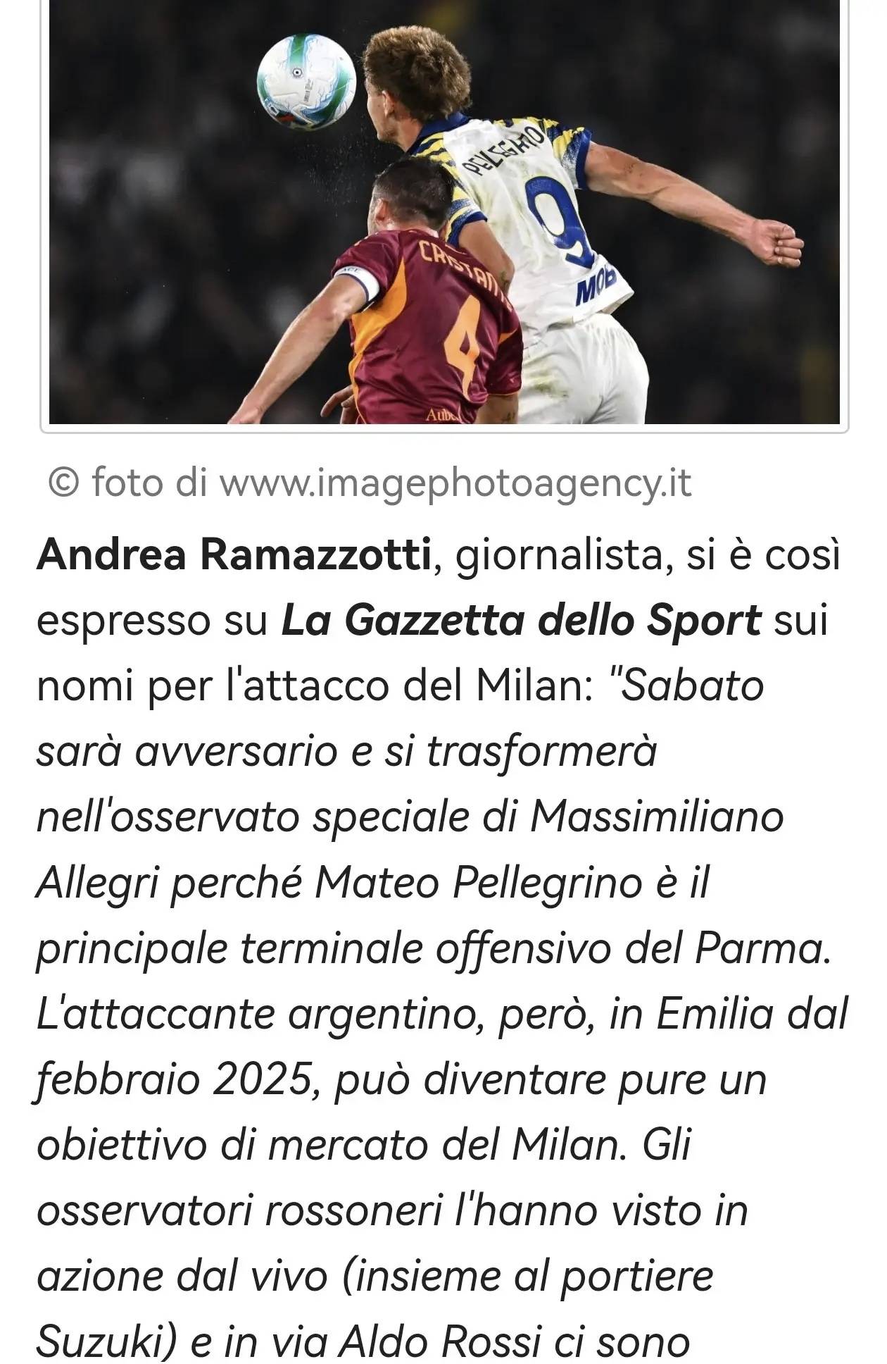 ใน La Gazzetta dello Sport นักข่าว Andrea Ramazzotti ได้พูดถึงเป้าหมายการย้ายทีมของมิลานสำหรับแนวรุก โดยระบุว่า: "ในบรรดาคู่แข่งในวันเสาร์นี้ ปาร์มา, Matteo Pellegrino จะถูกจับตามองอย่างใกล้ชิดจาก Massimiliano Allegri - กองหน้าชาวอาร์เจนตินาเป็นภัยคุกคามหลักในการโจมตีของปาร์มา"