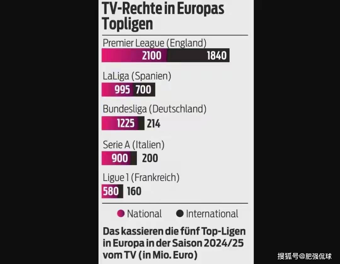 หากเราพิจารณาว่า รายได้จากการถ่ายทอดทางโทรทัศน์เป็นตัวชี้วัดที่ชัดเจนกว่า โดยยกตัวอย่างฤดูกาล 2024/25 นั้น สิทธิ์การถ่ายทอดในประเทศของพรีเมียร์ลีกสร้างรายได้ถึง 2.1 พันล้านยูโร และสิทธิ์การถ่ายทอดต่างประเทศสร้างรายได้ 1.84 พันล้านยูโร รวมเป็นเงินทั้งสิ้น 3.94 พันล้านยูโร ซึ่งสูงกว่าลีกใหญ่ ๆ อื่น ๆ ถึง 4 ลีกด้วยกัน ลาลีกาอยู่ในอันดับที่สอง โดยมีรายได้ในประเทศ 995 ล้านยูโร และรายได้จากต่างประเทศ 700 ล้านยูโร รวมเป็นเงินทั้งสิ้น 1.695 พันล้านยูโรบุนเดสลีกาตามมาด้วยมูลค่า 1.439 พันล้านยูโร (1.225 พันล้านยูโรในประเทศและ 214 ล้านยูโรในต่างประเทศ) อยู่ในอันดับที่สาม เซเรีย อา ซึ่งเคยได้รับการยกย่องว่าเป็นลีกชั้นนำของโลกและถูกขนานนามว่า "มินิเวิลด์คัพ" ตามมาในอันดับที่สี่ด้วยมูลค่า 1.1 พันล้านยูโร (900 ล้านยูโรในประเทศและ 200 ล้านยูโรในต่างประเทศ) ซึ่งเกือบจะแซงหน้าลีกเอิง 1 ที่ค่อนข้างไม่เป็นที่รู้จักโดยเฉพาะอย่างยิ่งในเรื่องสิทธิ์การถ่ายทอดทางโทรทัศน์ในต่างประเทศ จำนวน 200 ล้านยูโรของเซเรียอา คิดเป็นเพียง 28.6% ของรายได้ของลาลีกา และน้อยนิดเพียง 10.9% ของพรีเมียร์ลีก!