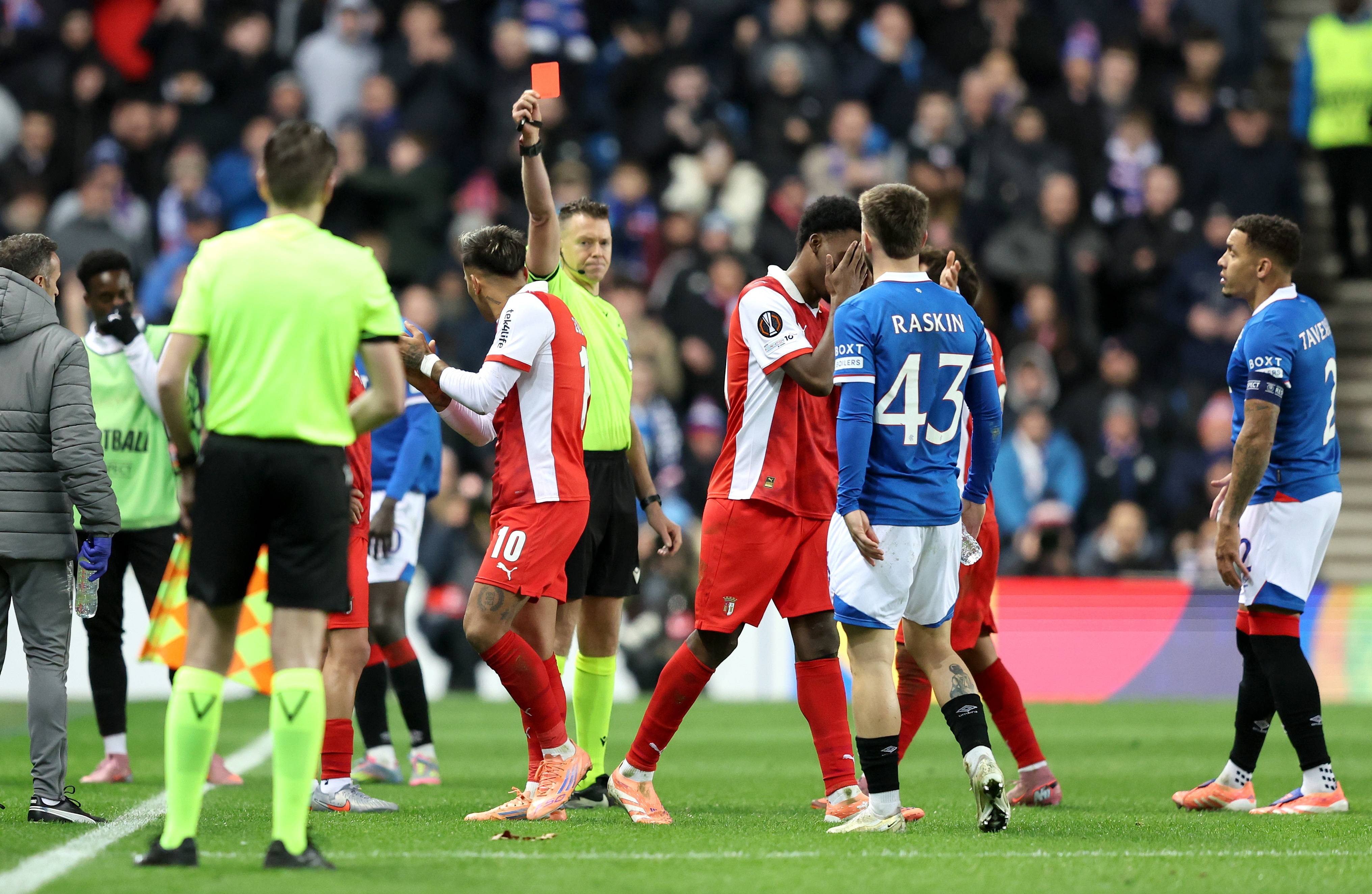 เมื่อวันที่ 27 พฤศจิกายน นักเตะบราการา ซาลาซาร์ (กลาง) ถูกผู้ตัดสินแจกใบแดง ซีเอ็นเอ/อีพีเอ