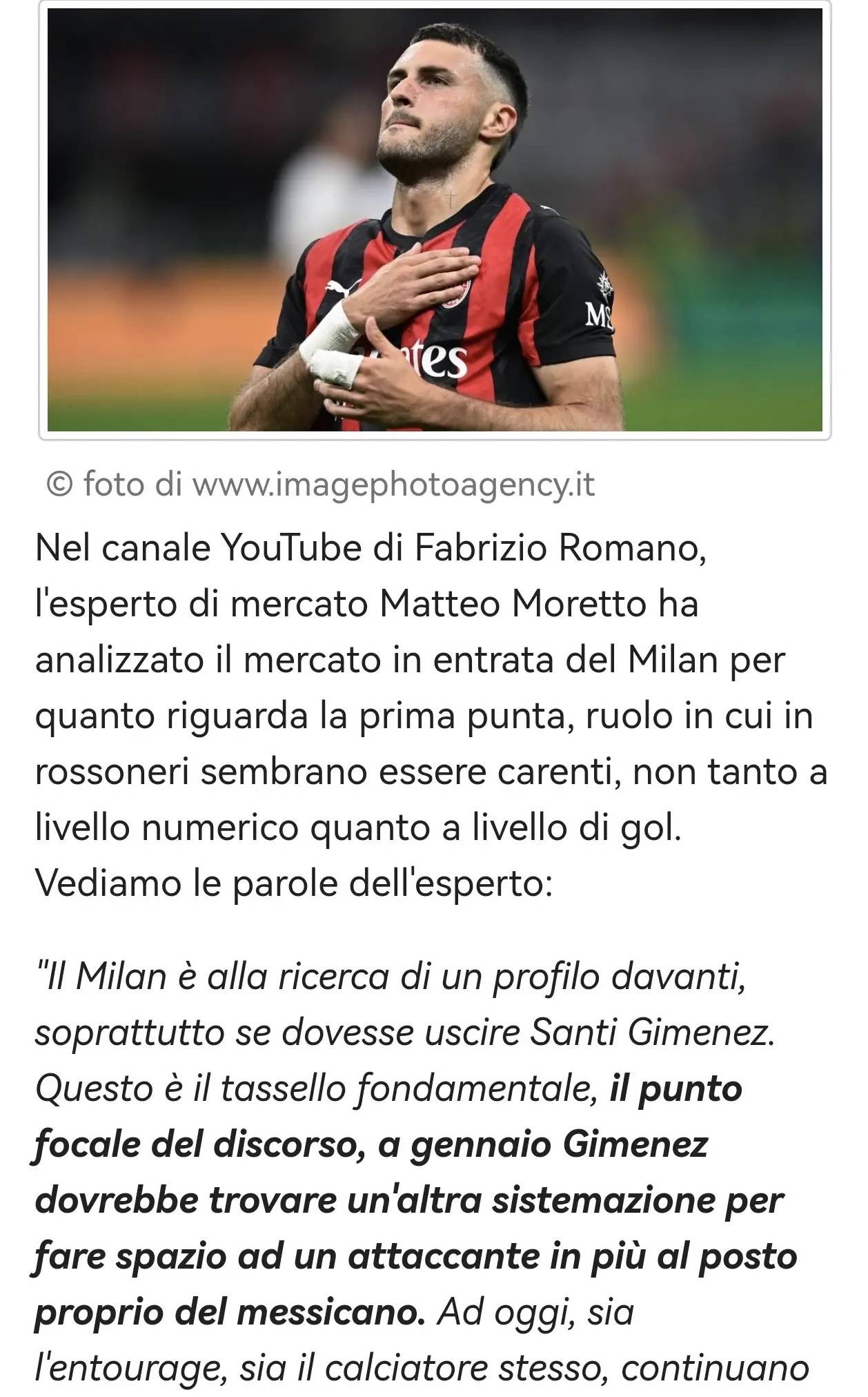 ในช่อง YouTube ของ Fabrizio Romano ผู้เชี่ยวชาญด้านการย้ายทีม Matteo Moretto ได้วิเคราะห์สถานการณ์การเสริมทัพในแนวรุกของเอซี มิลาน: