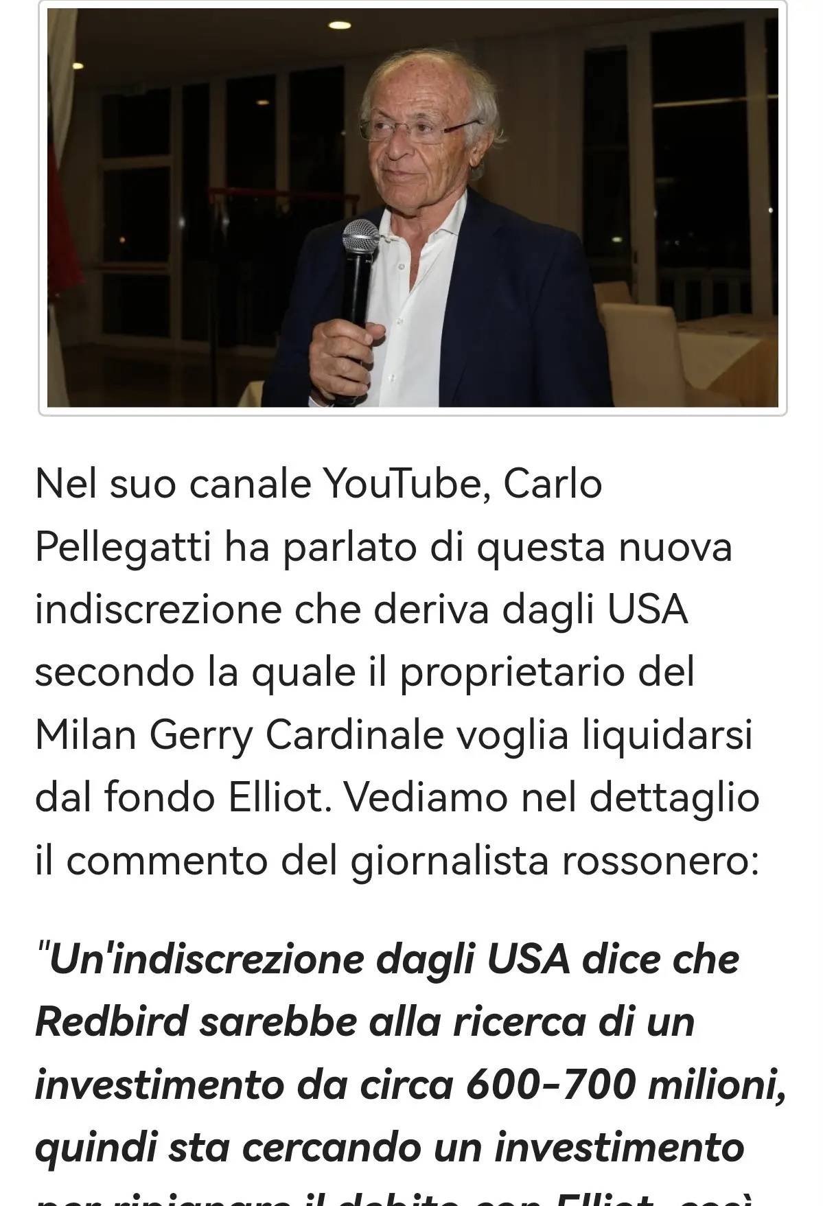 คาร์โล เปลเลกัตติ ได้กล่าวถึงข่าวลือใหม่นี้ซึ่งมีต้นกำเนิดมาจากสหรัฐอเมริกาในช่อง YouTube ของเขา โดยระบุว่า เจอร์รี คาร์ดินาล เจ้าของสโมสรเอซี มิลาน มีความประสงค์ที่จะชำระหนี้กับเอลเลียตต์ แมเนจเมนต์ ด้านล่างนี้คือความคิดเห็นโดยละเอียดจากผู้สื่อข่าวประจำทีมรอสโซเนรี: