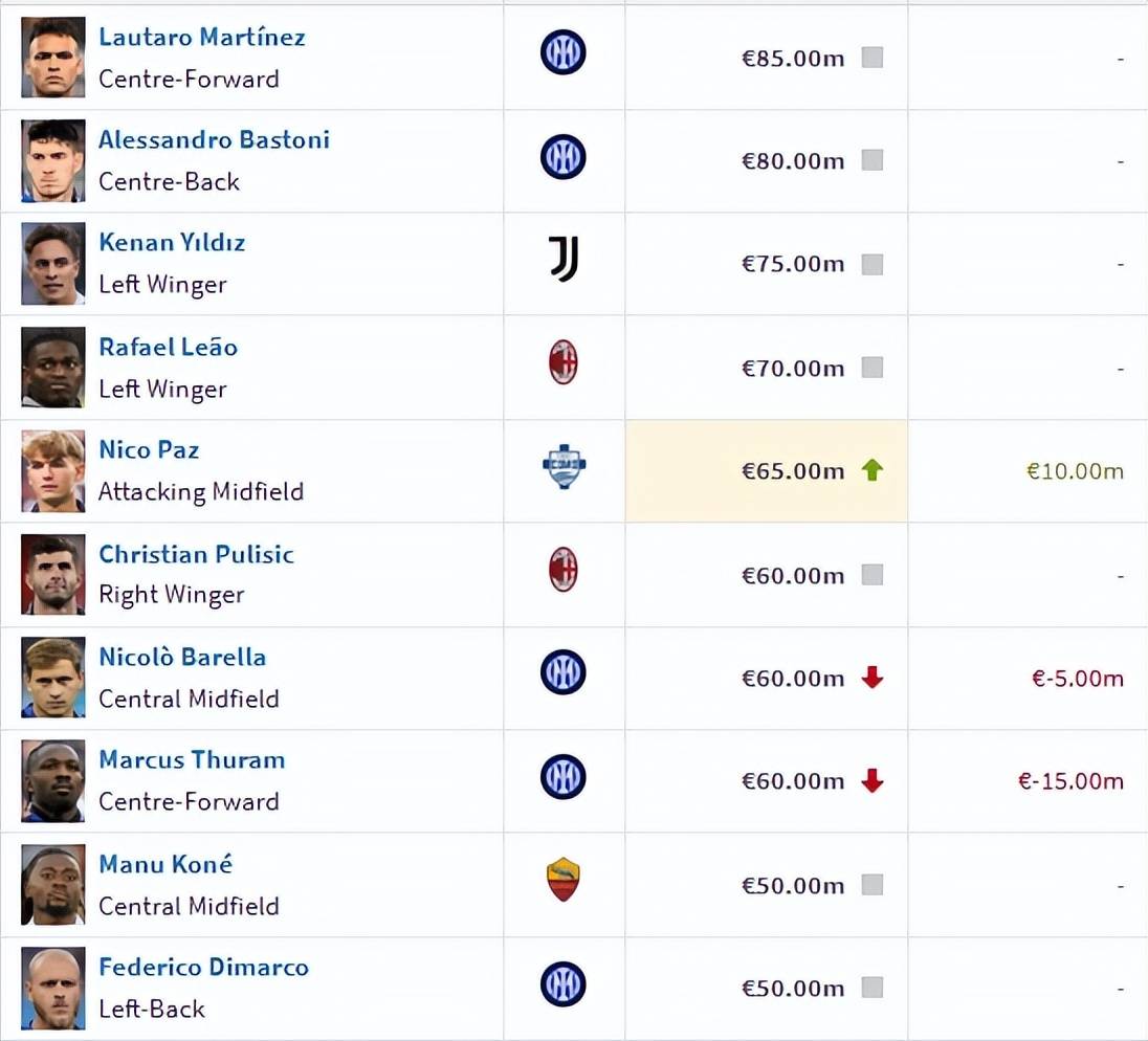- 第五:尼科-帕斯,科莫/阿根廷,身价6500万欧元(+1000万)。