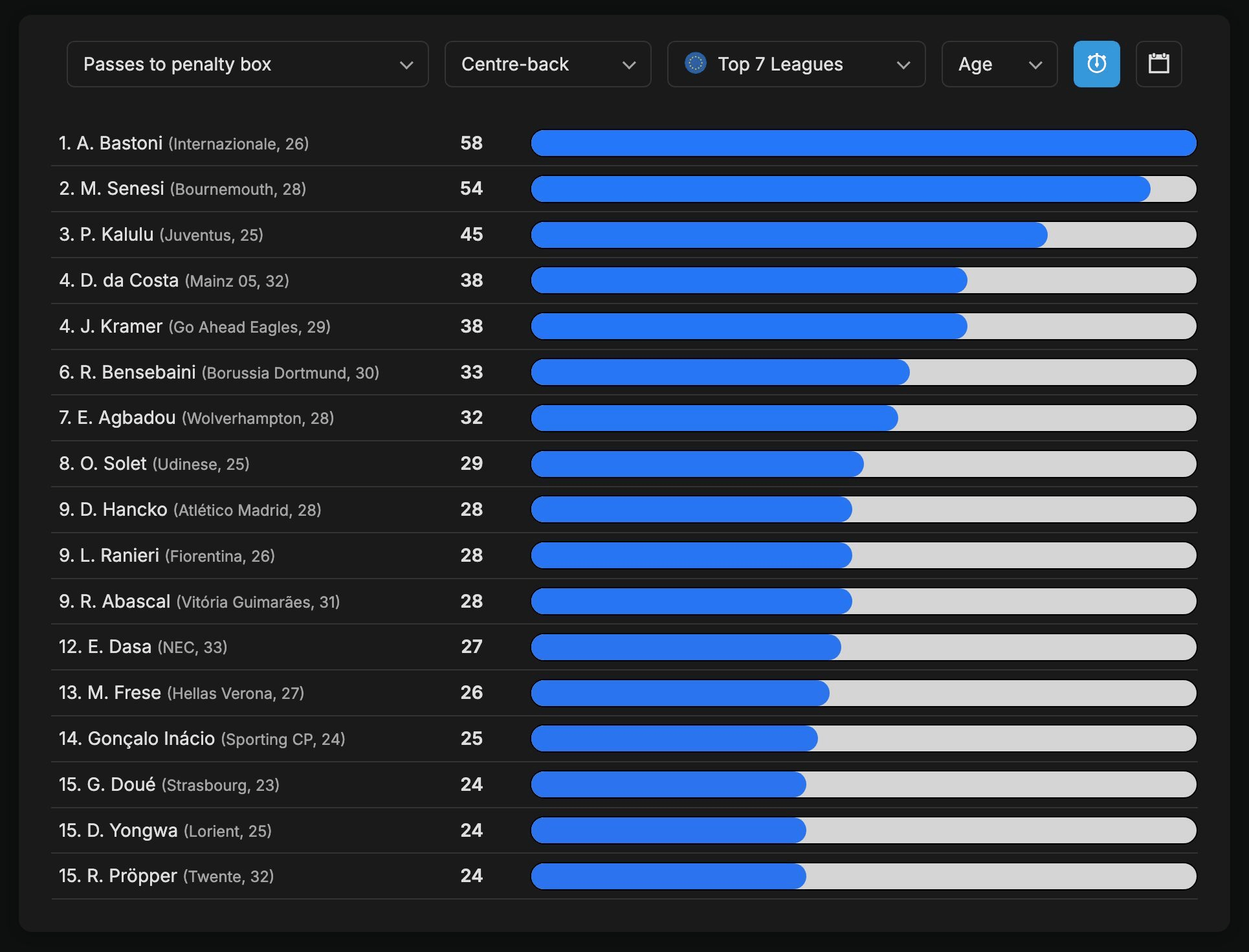 สถิติ เปิดเผยว่าในบรรดาเซ็นเตอร์แบ็คในเจ็ดลีกชั้นนำของยุโรปในฤดูกาลนี้ เซเนซีอยู่ในอันดับที่สองรองจากบาสโตนีเท่านั้นในจำนวนการส่งบอลเข้าไปในเขตโทษ ทำให้เขาอยู่ในอันดับที่สองในหมู่เพื่อนร่วมอาชีพทั้งหมด