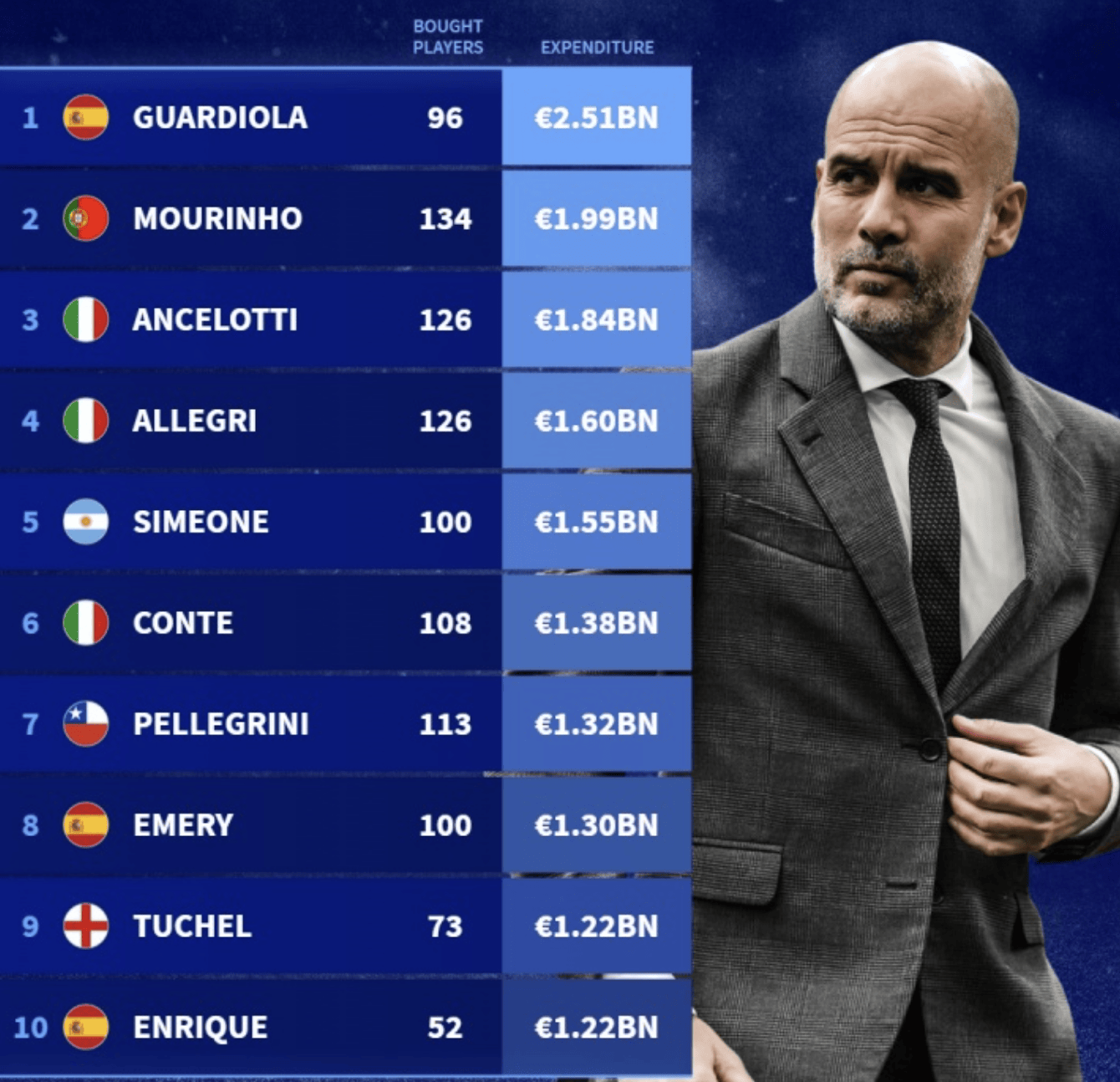 เป๊ป กวาร์ดิโอลา เริ่มต้นอาชีพการเป็นผู้จัดการทีมที่บาร์เซโลนา ก่อนที่จะไปคุมทีมที่บาเยิร์น มิวนิก และแมนเชสเตอร์ ซิตี้ ในช่วงเวลาที่เขาคุมทีมทั้งสามสโมสรใหญ่แห่งนี้ กวาร์ดิโอลาได้ลงทุนอย่างหนักในการซื้อตัวนักเตะ โดยรวบรวมทีมที่เต็มไปด้วยนักเตะดาวดัง สถิติแสดงให้เห็นว่าเขาใช้เงินไปทั้งหมด 2.51 พันล้านยูโรในการเซ็นสัญญากับนักเตะ 96 คน แน่นอนว่าเขายังพาทีมคว้าแชมป์มากมายให้กับสโมสรที่เขาคุมทีมอีกด้วย