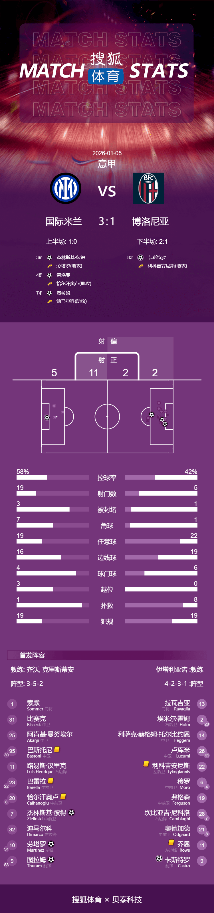 เวลา 03:45 น. ตามเวลาปักกิ่ง วันที่ 5 มกราคม 2026 อินเตอร์ มิลาน เปิดบ้านรับการมาเยือนของโบโลญญา ในรอบที่ 18 ของเซเรีย อาในครึ่งแรก ปีโอเตอร์ เซียลินสกี้ ทำประตูแรกให้กับอินเตอร์ มิลาน จากแอสซิสต์ของเลาตาโร มาร์ติเนซ ในครึ่งหลัง เลาตาโร และมาร์คัส Thuram ทำประตูเพิ่มคนละหนึ่งประตู ขณะที่โรดริโก คาสโตร ทำประตูตีตื้นให้กับโบโลญญา ในที่สุด อินเตอร์ มิลาน ชนะโบโลญญา 3-1 รักษาตำแหน่งจ่าฝูงของเซเรีย อา ไว้ได้ พวกเขามีคะแนนนำหน้าเอซี มิลาน หนึ่งคะแนน และนำหน้าเนเปิลส์ สองคะแนน