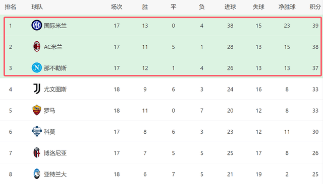 ด้วยสามทีมชั้นนำทั้งหมดคว้าชัยชนะในรอบนี้ ช่องว่างระหว่างพวกเขายังคงไม่เปลี่ยนแปลง อย่างไรก็ตาม สองคู่แข่งที่น่าเกรงขามซึ่งตามหลังอยู่กลับสะดุดในช่วงเวลาสำคัญ: ยูเวนตุสถูกเลชเช่เสมอที่บ้าน ขณะที่โรม่าพ่ายแพ้ในการเยือนอตาลันต้า สองทีมยักษ์ใหญ่เหล่านี้ตามหลังผู้นำอินเตอร์ มิลานอยู่หกแต้ม โดยเล่นมากกว่าหนึ่งนัด ทำให้ความหวังในการคว้าแชมป์ของพวกเขาดูเลือนลางมากขึ้นเรื่อยๆหากไม่มีอะไรที่น่าประหลาดใจเกิดขึ้นอย่างใหญ่หลวง ฤดูกาลนี้แชมป์กัลโช่ เซเรีย อา จะเป็นการแข่งขันระหว่าง อินเตอร์ มิลาน, เอซี มิลาน และ นาโปลี ด้วยฟอร์มที่ไม่คงเส้นคงวาของทีมท็อป 3 ทำให้ตำแหน่งแชมป์ยังคงไม่แน่นอนอย่างมาก ฤดูกาลนี้ การที่ เอซี มิลาน ไม่ได้แข่งขันในรายการยุโรปทำให้หลายคนชื่นชอบพวกเขามากขึ้นเล็กน้อย อย่างไรก็ตาม จนถึงตอนนี้พวกเขายังไม่สามารถใช้ประโยชน์จากข้อได้เปรียบทางร่างกายได้ และไม่ได้เป็นผู้นำในลีกด้วยซ้ำในแง่ของกำลังโดยรวม เอซี มิลาน ยอมรับว่าตามหลังทั้ง อินเตอร์ และ นาโปลี อย่างไม่ต้องสงสัย เมื่อเข้าสู่ครึ่งหลังของฤดูกาล เมื่ออินเตอร์และนาโปลีถอนตัวจากแชมเปียนส์ลีก การท้าชิงแชมป์ของเอซี มิลาน น่าจะยิ่งท้าทายมากขึ้นไปอีก!