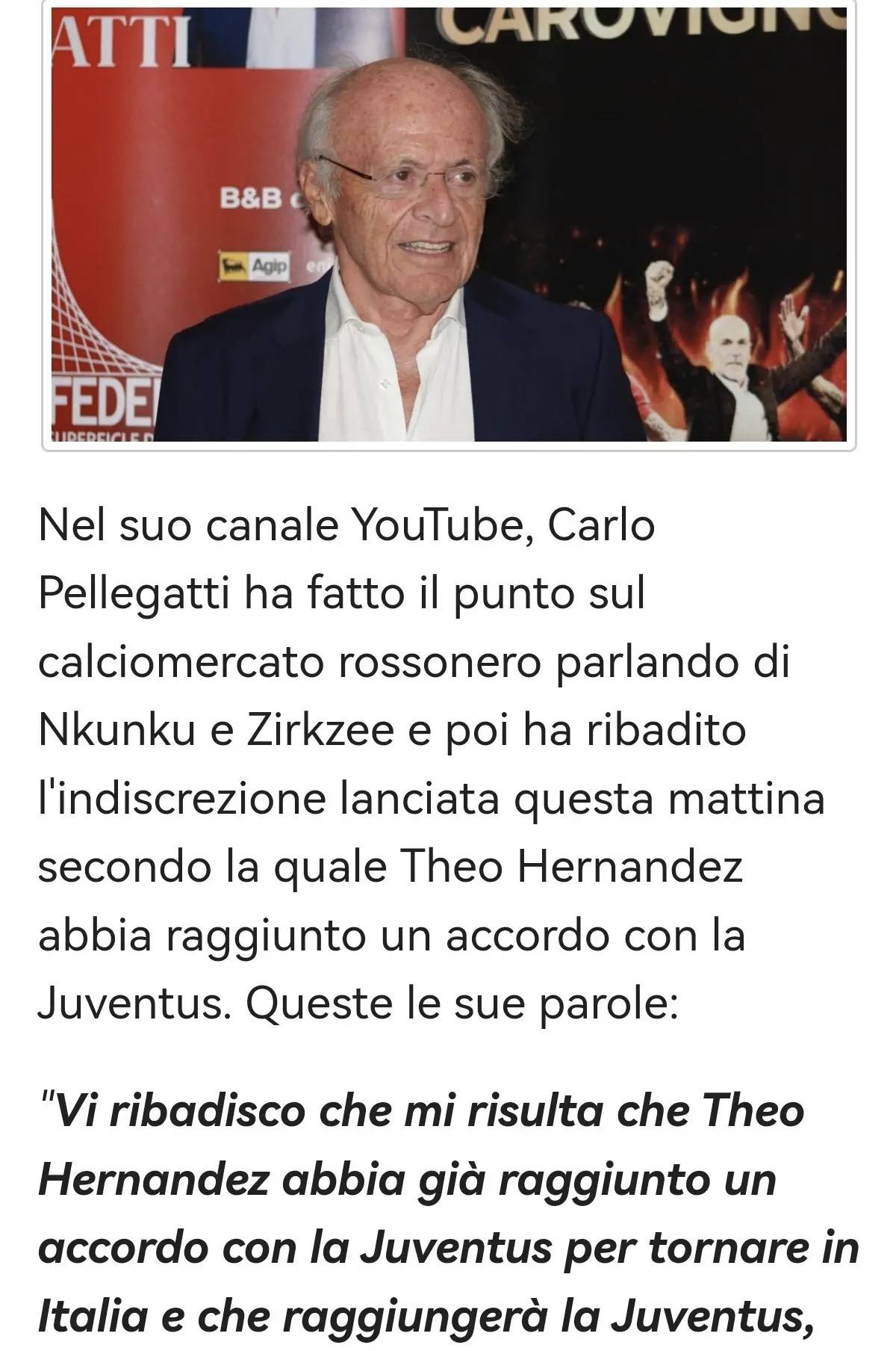 คาร์โล เปลเลกัตติ แสดงความคิดเห็นเกี่ยวกับกิจกรรมในตลาดซื้อขายนักเตะของมิลานผ่านช่อง YouTube ส่วนตัวของเขา โดยพูดถึงนคุนคูและซิร์คเซ่ พร้อมทั้งย้ำข่าวลือสำคัญที่ปรากฏในช่วงเที่ยงวันนี้ว่า เตโอ แอร์นานเดซ ได้บรรลุข้อตกลงกับยูเวนตุสแล้ว คำพูดของเขาโดยละเอียดมีดังนี้: