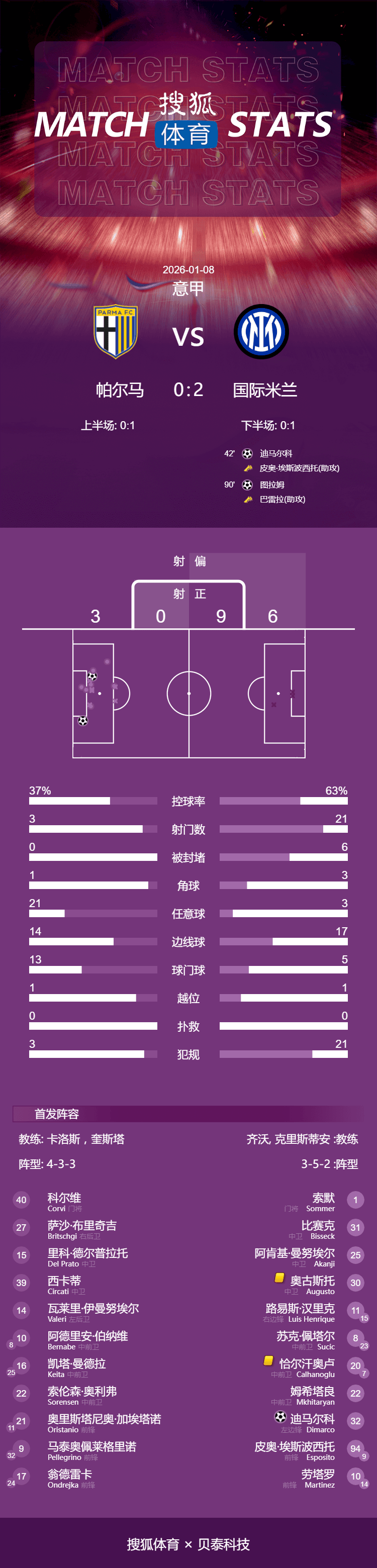 เวลา 03:45 น. ตามเวลาปักกิ่ง วันที่ 8 มกราคม 2026 ปาร์มาเปิดบ้านต้อนรับการมาเยือนของอินเตอร์ มิลาน ในรอบที่ 19 ของเซเรีย อาในครึ่งแรก ดimarco ทำประตูแรกได้จากการช่วยเหลือของ Pio Esposito ในครึ่งหลัง Thuram ยิงประตูชัยในช่วงทดเวลาบาดเจ็บ ในที่สุด อินเตอร์ มิลาน ก็เอาชนะปาร์มาไปได้ 2-0 รักษาตำแหน่งจ่าฝูงของตารางลีกไว้ได้ ขณะที่ปาร์มาอยู่ในอันดับที่ 15