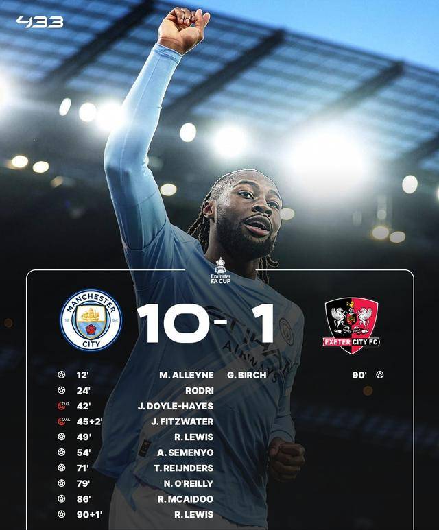 เสียงนกหวีดสุดท้ายดังขึ้นพร้อมกับคะแนนที่หยุดอยู่ที่ 10-1 อย่างน่าตกใจ ขณะที่แมนเชสเตอร์ ซิตี้ ถล่มเอ็กเซเตอร์ ซิตี้ ไปถึงสิบประตู คว้าชัยชนะและผ่านเข้าสู่รอบสี่ของศึกเอฟเอ คัพ!
