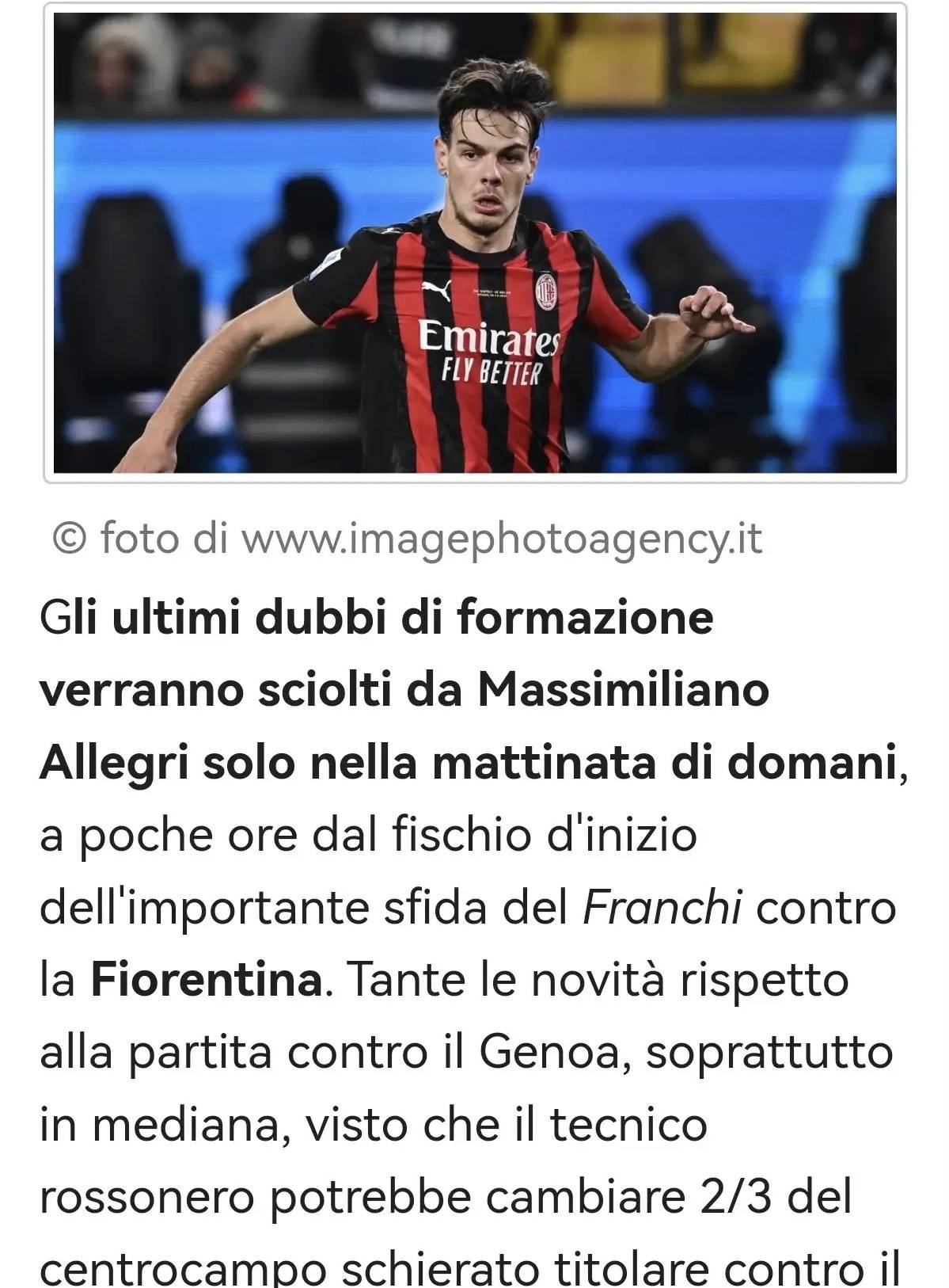 นอกเหนือจากลูก้า โมดริช—ซึ่งอัลเลกรีได้ประกาศในงานแถลงข่าวก่อนการแข่งขันว่าจะได้พัก—ยูสซูฟ โฟฟาน่า อาจเริ่มต้นบนม้านั่งสำรองในเกมพบกับฟิออเรนติน่าด้วย ตรงกันข้ามกับที่คาดการณ์ไว้ก่อนหน้านี้ กองกลางชาวฝรั่งเศสอาจต้องเสียตำแหน่งให้กับอาร์ดอน จาชารีตั้งแต่เริ่มต้นยัสซารีเป็นหนึ่งในเป้าหมายการย้ายทีมหลักของมิลานในช่วงตลาดซื้อขายฤดูร้อนที่ผ่านมา แต่จนถึงขณะนี้เขายังไม่สามารถคว้าโอกาสที่รอคอยมานานในการลงสนามได้