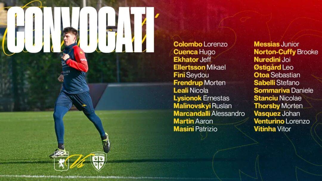 13 มกราคม, 1:30, เซเรีย อา นัดที่ 20: กีโนอา ทีมอันดับที่ 19 เปิดบ้านรับการมาเยือนของคาลยารี ทีมอันดับที่ 15